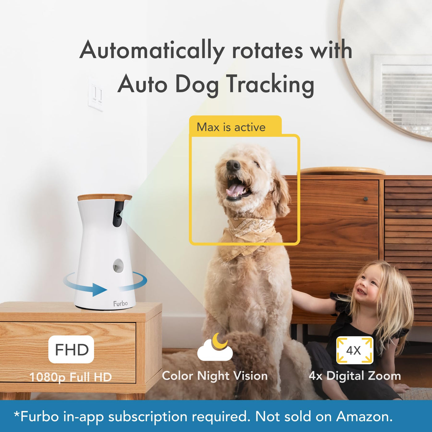 The new Furbo 360 Dog Camera Premium Safety Package - Subscription Required lets family members know whats happening at home and to see, talk and toss treats from anywhere. This new packaged bundle requires a paid subscription (3-mo. minimum monthly or yearly options available, cancel anytime) to use its features. You will be required to set up a subscription during device set up. Furbo 360 works best when used with premium mothly service plan, Furbo Dog Nanny. This pair gives you the complete package and is designed to give you best-in-class HD video quality with 360-degree rotating security camera for full room coverage, day & night, in addition to, Furbo's suite of smart alerts designed especially for dogs. Use the Furbo app from your iPhone iOS device or Android phone to access the indoor camera to view stunning 1080p live view, high quality 4x zoom, and enhanced color night vision with infrared technology. Enhance your home security with this whole-room view camera, speak clearly with 2-way audio, and toss treats to pets wherever they are. Compatible with Amazon Alexa by Amazon, the Furbo 360 Dog Camera lets you speak clearly with two-way audio to family and toss treats to pets wherever they are. Now enabled with AI technology for dog auto-tracking across the room and always improving smart alerts to your phone, you can know whats going on in your home from anywhere and never miss a moment. The Furbo 360 Dog Camera: Premium Safety Package is Furbo's latest and greatest solution that provides unparalleled peace of mind to dog parents, and helps you stay connected with your furry friends.