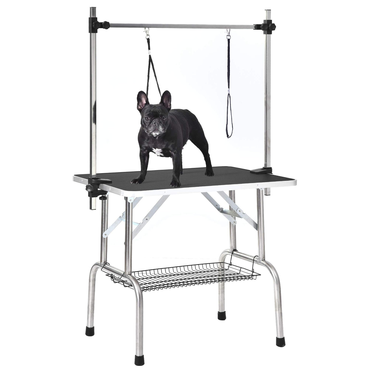 Q: Is the grooming table adjustable for different dog sizes?A: Yes, the grooming table features an adjustable arm that can be extended up to 36 inches, allowing you to customize the height for different pet sizes.