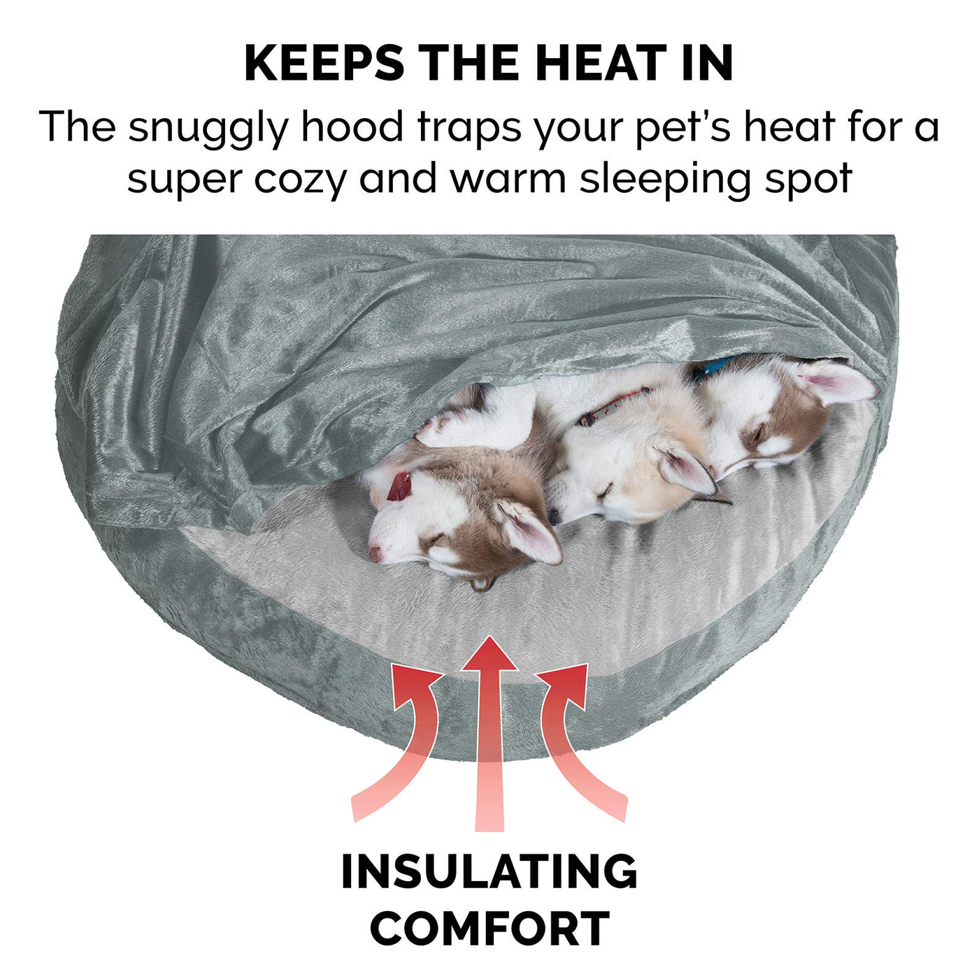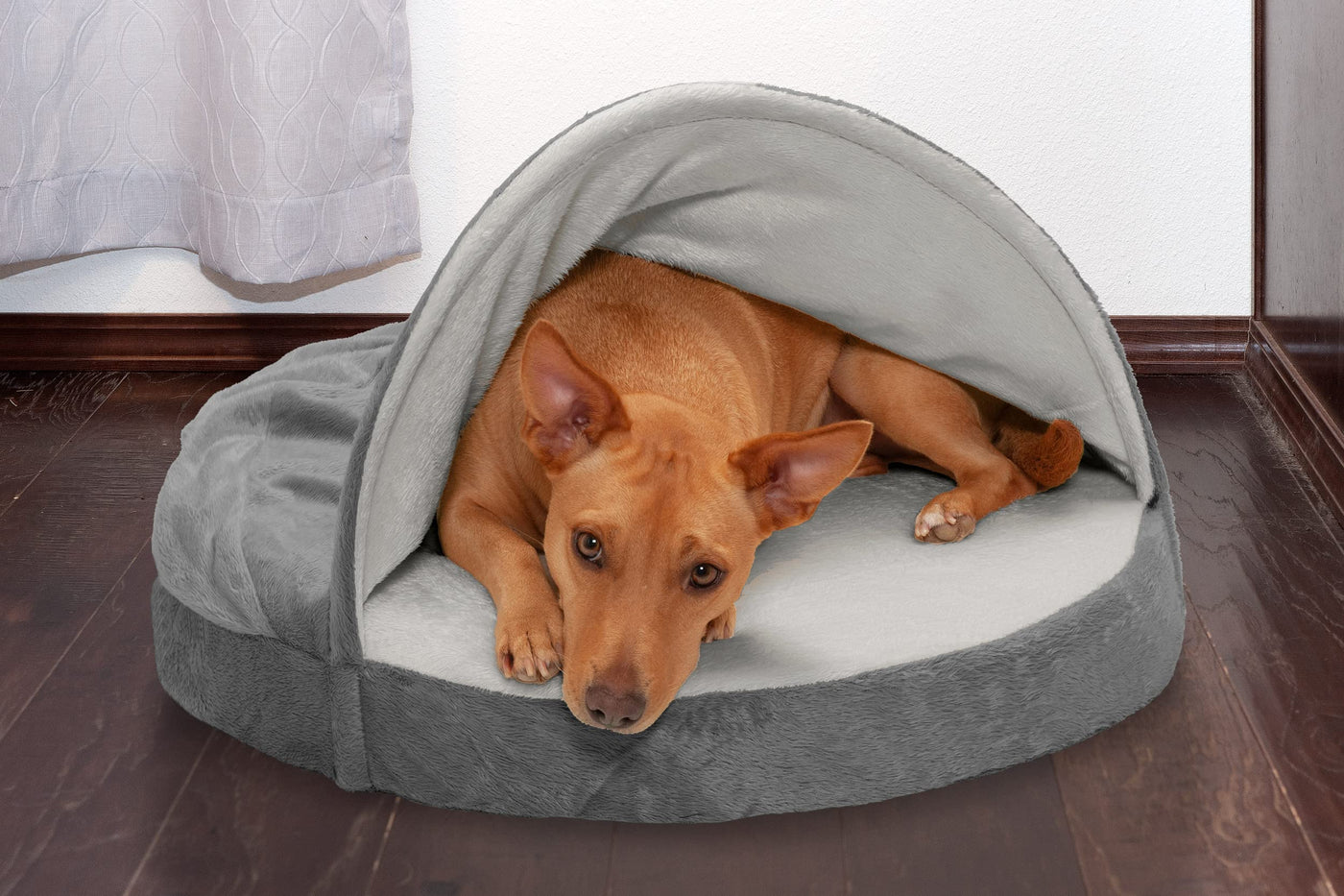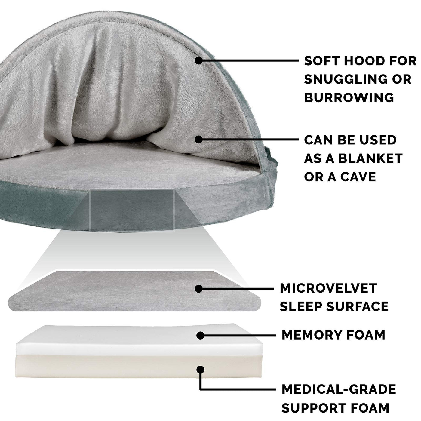 Undercover comfort is here with the Furhaven Microvelvet Snuggery Dog Bed! Made of super cozy micro velvet fabric inside and out, this cuddly burrow-style pet bed is the perfect solution for snugglebugs who love to crawl under the covers. The soft hood features a flexible and removable hoop to best suit your pets sleep style and burrow habits. Use the hoop and the hood looks more like a cave allowing easy access to the interior. For pets who enjoy crawling under blankets, remove the hoop and they can snuffle their way in to their favorite sleep spot. Our laminated memory foam top pet bed core provides just the right amount of comfort and support to maximize your pets rest and relief. The memory foam top absorbs and holds your pets body heat for maximum insulation and warmth while conforming to your pets unique shape to best support joints and relieve pressure points. We pair the benefits of memory foam with a medical-grade polyurethane foam base to maximize its benefits and ensure the best support for your pet. All foam used in the manufacture of this product is made in the USA and has been certified and rigorously tested to ensure it meets standards for content, emissions and durability by CertiPUR-US. Easy to clean. Cover care: Remove from core before washing (see hang tag and/or seam label for care instructions). Foam care: Memory foam is highly absorbent. Spot clean with mild soap or enzyme-based cleaning spray. Rinse but DO NOT SOAK OR SUBMERGE. Press out moisture with a dry towel and air dry. A fan may be used to speed drying. Do not wring or place in machine dryer. Dry completely before use. Not for unsupervised use by animals with destructive chewing behavior.