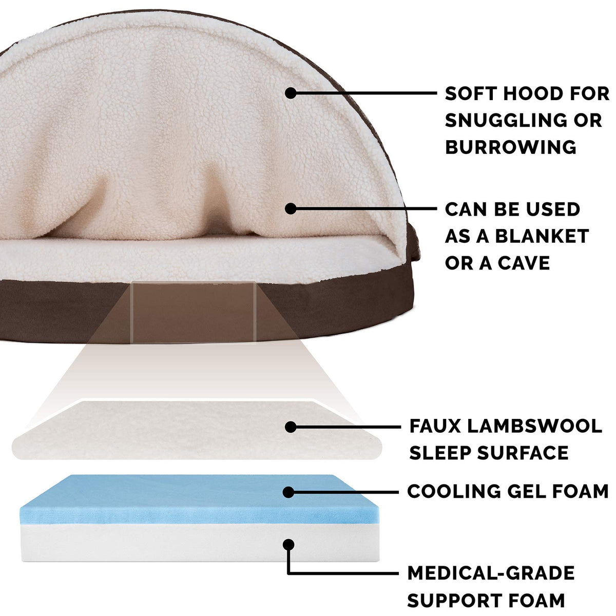Cozy Comfort With A Cooling Twist! Pets Who Love To Burrow Under The Covers Will Enjoy The Furhaven Sherpa & Suede Snuggery Dog Bed. This Bed Features A Soft Extra Layer Of Fabric Over The Sleep Surface That Can Be Used As Traditional Burrow ''Blanket'' Or (By Inserting The Provided Flexible Hoop) As A Private ''Cave'' For Your Pet. Lustrous Suedine Fabric On The Exterior And Gusset Provides A Stylish, Soft Look That Resists Stains And Cleans Up Easily, While Soft Sherpa Sleep Surface And Hood-Lining Is Super Snuggly. Our Laminated Gel Foam Top Pet Bed Core Features Gel-Infused Memory Foam That Is Pressure-Activated To Absorb Your Pet'S Body Heat And Disperse It Away From Their Body To Provide A Cooling Effect. Just Like Traditional Memory Foam, The Gel Top Foam Will Conform To Your Pet'S Unique Shape To Provide The Best Support For Joints And To Relieve Pressure Points. We Pair The Benefits Of Cooling Gel Memory Foam With A Medical-Grade Polyurethane Foam Base To Maximize Its Benefits And Ensure The Best Support For Your Pet. All Foam Used In The Manufacture Of This Product Is Made In The Usa And Has Been Certified And Rigorously Tested To Ensure It Meets Standards For Content, Emissions And Durability By Certipur-Us. Easy To Clean. Cover Care: Remove From Core Before Washing (See Hang Tag And/Or Seam Label For Care Instructions). Foam Care: Cooling Gel Foam Is Highly Absorbent. Spot Clean With Mild Soap Or Enzyme-Based Cleaning Spray. Rinse But Do Not Soak Or Submerge. Press Out Moisture With A Dry Towel And Air Dry. A Fan May Be Used To Speed Drying. Do Not Wring Or Place In Machine Dryer. Dry Completely Before Use. Not For Unsupervised Use By Animals With Destructive Chewing Behavior.