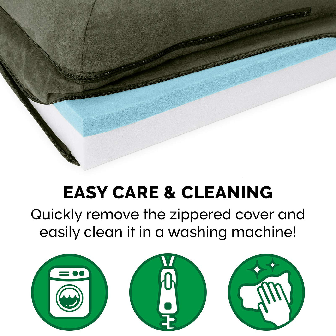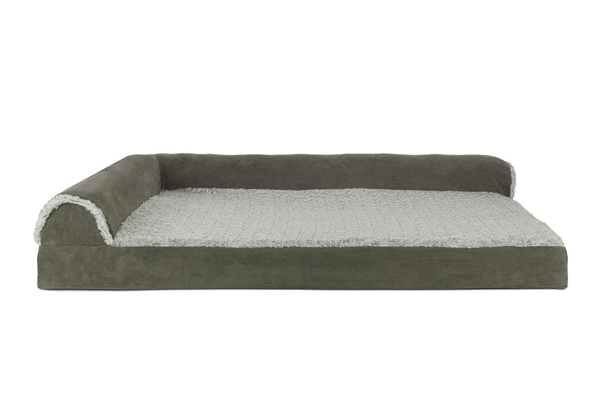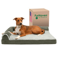 Pamper your pet with a Furhaven Two-Tone Faux Fur & Suede L Chaise Dog Bed! A luxuriously soft faux fur sleep surface is complemented by suedine bolsters and gusset. Ultra plush, flecked faux fur provides a snuggly soft sleep surface and trims the edges of the bolster for a chic flair. The two-tone design hides dirt and pet dander better than traditional plush sleep surfaces. The L-shaped bolsters support your pet’s back and hips, providing additional support. The L-shape also provides the perfect nook for pets that like to nest into comfort. The two raised, rounded bolster ends allow your pet to lay their paws or neck on the pillowed edge, helping to align the neck and spine. The medical-grade foam core includes a layered orthopedic foam core topped with gel-infused memory foam. Micro gel beads help keep the bed cooler while memory foam conforms to your pet's shape providing superior support of joints and pressure points. Gel foam has cooling properties reducing the sleeping surface by 1 or 2 degrees, wicking heat away from your pet. The superior support provided by both foam cores will help your pet reach a deeper, more restorative rest for your pet's health. Available in various stylish colors and diverse sizing options so your pet can sprawl and lounge the day in maximum comfort and style. Easy to clean. Cover care: Remove from core before washing (see seam label for fabric care instructions). Foam care: Cooling gel foam is highly absorbent. Spot clean with mild soap or enzyme-based cleaning spray. Rinse but DO NOT SOAK OR SUBMERGE. Press out moisture with a dry towel and air dry. A fan may be used to speed drying. Do not wring or place in machine dryer. Dry completely before use. Not for unsupervised use by animals with destructive chewing behavior.