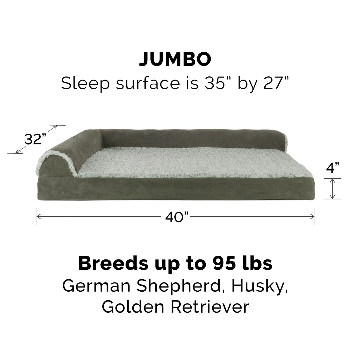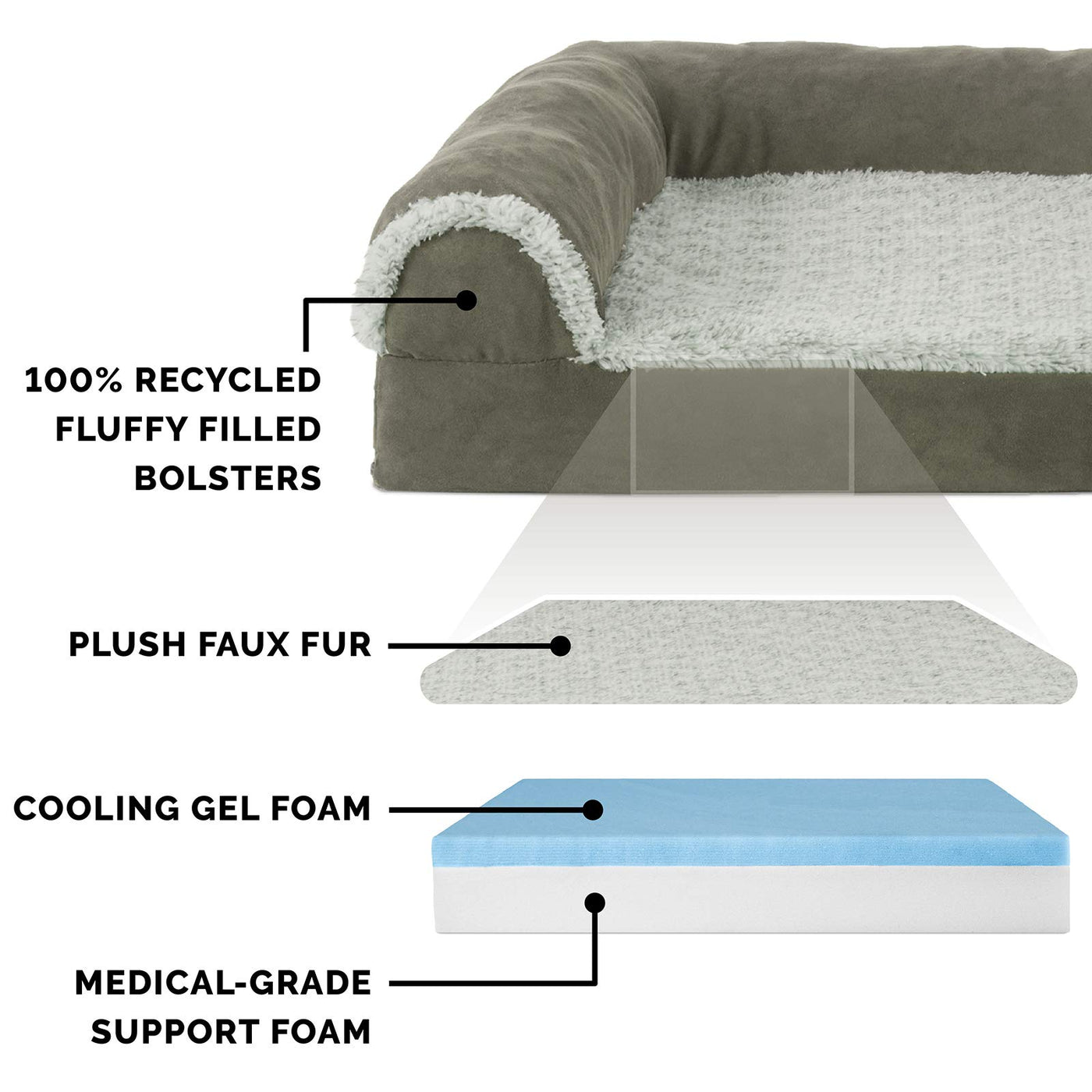 Furhaven Cooling Gel Dog Bed For Large Dogs W/ Removable Bolsters & Washable Cover, For Dogs Up To 95 Lbs - Two-Tone Plush Faux Fur & Suede L Shaped Chaise - Dark Sage, Jumbo/Xl
