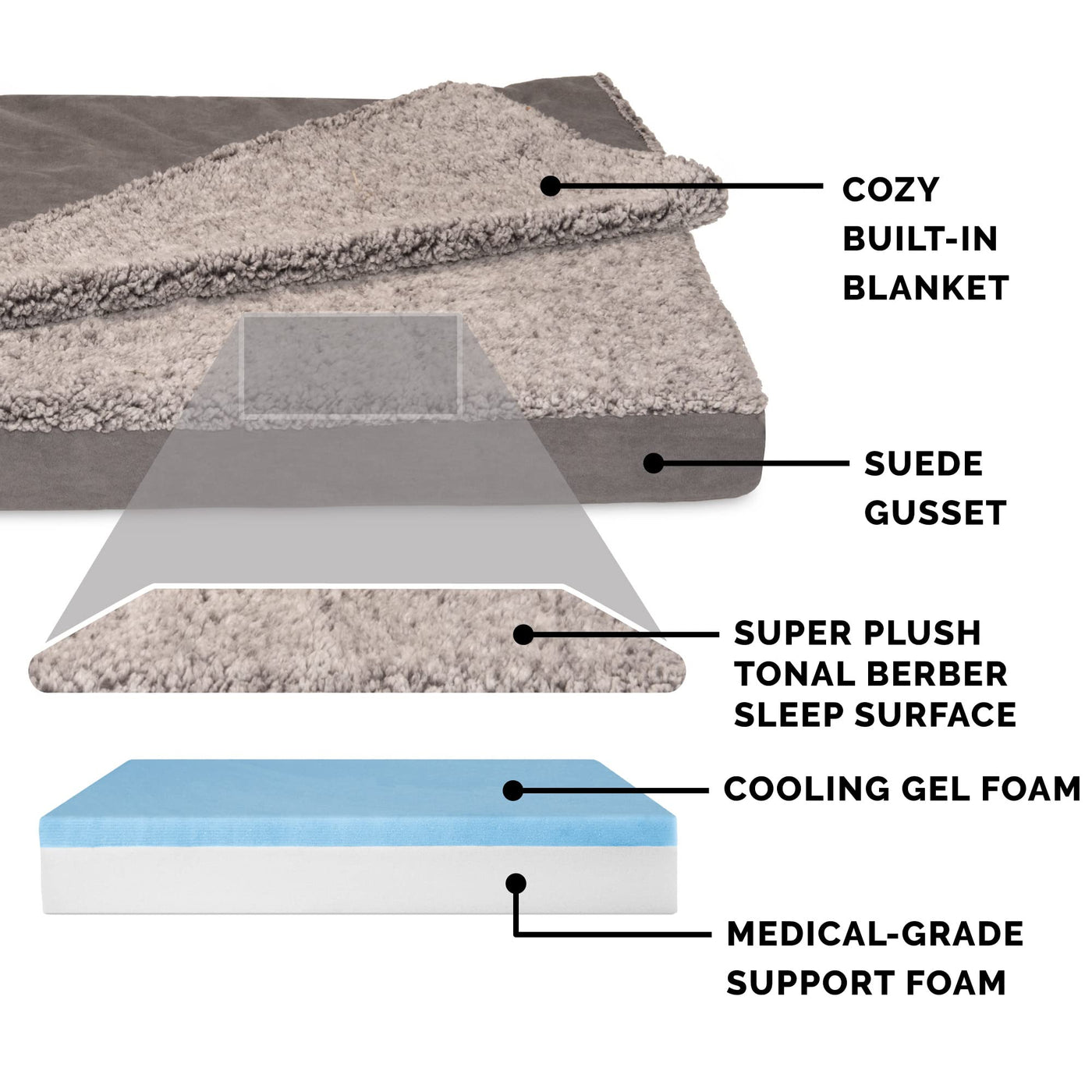 Furhavens Berber & Suede Blanket Top Mattress Dog Bed is designed for dogs and cats that love to burrow and snuggle! Featuring an attached oversized blanket top, the bed provides a warm and cozy lounging space for pets that love to curl up under the covers. Cuddly-soft berber fleece lines the blanket interior and main sleep surface, creating a super cozy environment for snoozing pups. The mattress core is topped with a layer of cooling gel infused memory foam that contours to your pets figure for improved body alignment and joint relief; the base features a medical-grade solid foam core for better support and value. The gel foam boasts cooling properties that reduce the sleep surface temperature by 1 or 2 degrees, wicking heat away from your pet to help keep them cool. Easy to clean. Cover care: Remove from core before washing (see seam label for fabric care instructions). Foam care: Cooling gel foam is highly absorbent. Spot clean with mild soap or enzyme-based cleaning spray. Rinse but DO NOT SOAK OR SUBMERGE. Press out moisture with a dry towel and air dry. A fan may be used to speed drying. Do not wring or place in machine dryer. Dry completely before use. Not for unsupervised use by animals with chewing behaviors.