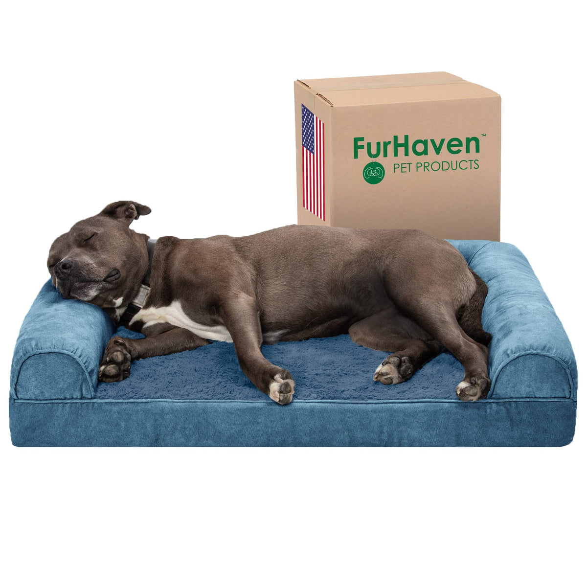 Furhaven Large Orthopedic Dog Bed Faux Fur & Velvet Sofa-Style W/ Removable Washable Cover - Harbor Blue, Large