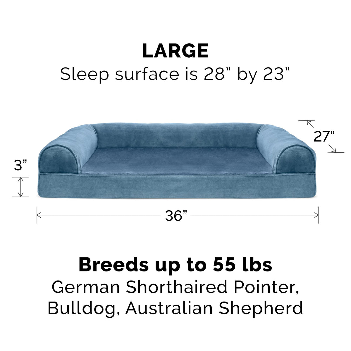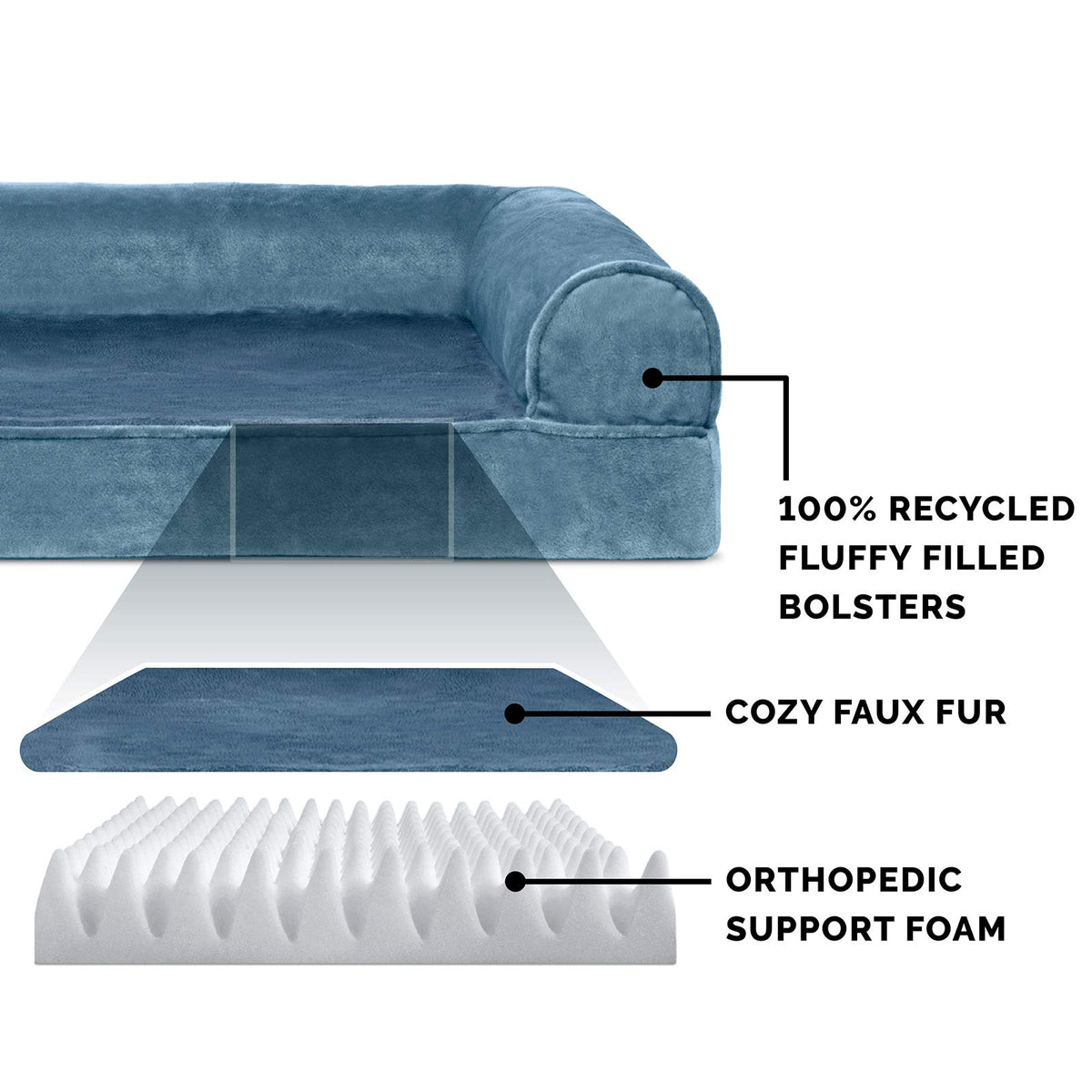Finally, a solution for your arthritic pet's pain! This Furhaven Faux Fur & Velvet Sofa-Style Dog Bed has a soft, faux fur sleep surface providing your pet comfort while the orthopedic (egg crate) foam base supports your dog's joints and pressure points. The Jumbo Plus option, for larger breeds, features solid slab orthopedic foam for greater support and comfort. Luxurious velvet gusset is dyed to match the faux fur sleep surface, creating a bed fit for a furry king or queen. The sofa bed has three walls to give your pup a variety of positions to lay in while remaining comfortable. Your best friend deserves a good night’s rest and now, it’s possible. With their very own orthopedic pet bed, your loved one will have maximum comfort for a great night's rest. Any position will do on this sofa bed! The squishy bolsters on three sides provide comfort for your pet to lay down in a variety of ways while always being provided the support they need. For example, your dog can lay on their tummy and use one of the bolsters as a pillow for a cozy night of sweet dreams. Cats love our sofa beds also! The bolsters provide cozy walls for your feline friend to snuggle into for their cat naps. This luxurious orthopedic pet couch provides a cozy spot for your companion to snuggle up in, leaving your favorite spot on the couch all for you! Easy to clean. Cover care: Remove from core before washing (see seam label for fabric care instructions). Foam care: Spot clean with mild soap; rinse. Blot, then air dry. Do not wring. Not for unsupervised use by animals with chewing behaviors.