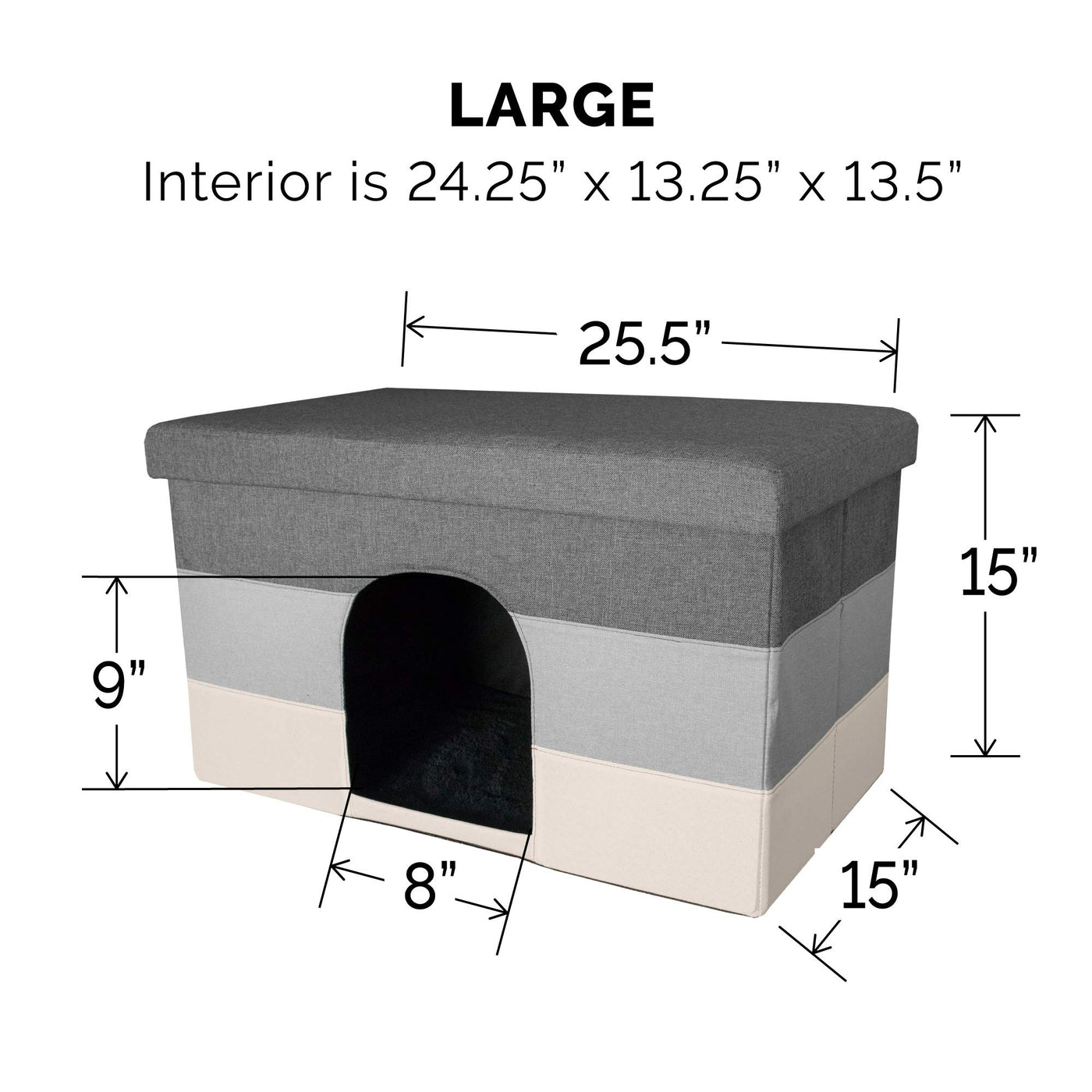 Q: What are the dimensions of the Furhaven Large Pet House Ottoman?A: The Furhaven Large Pet House Ottoman measures 25.5 inches in length, 15 inches in width, and 15 inches in height, making it a perfect fit for pets and a stylish addition to your living space.