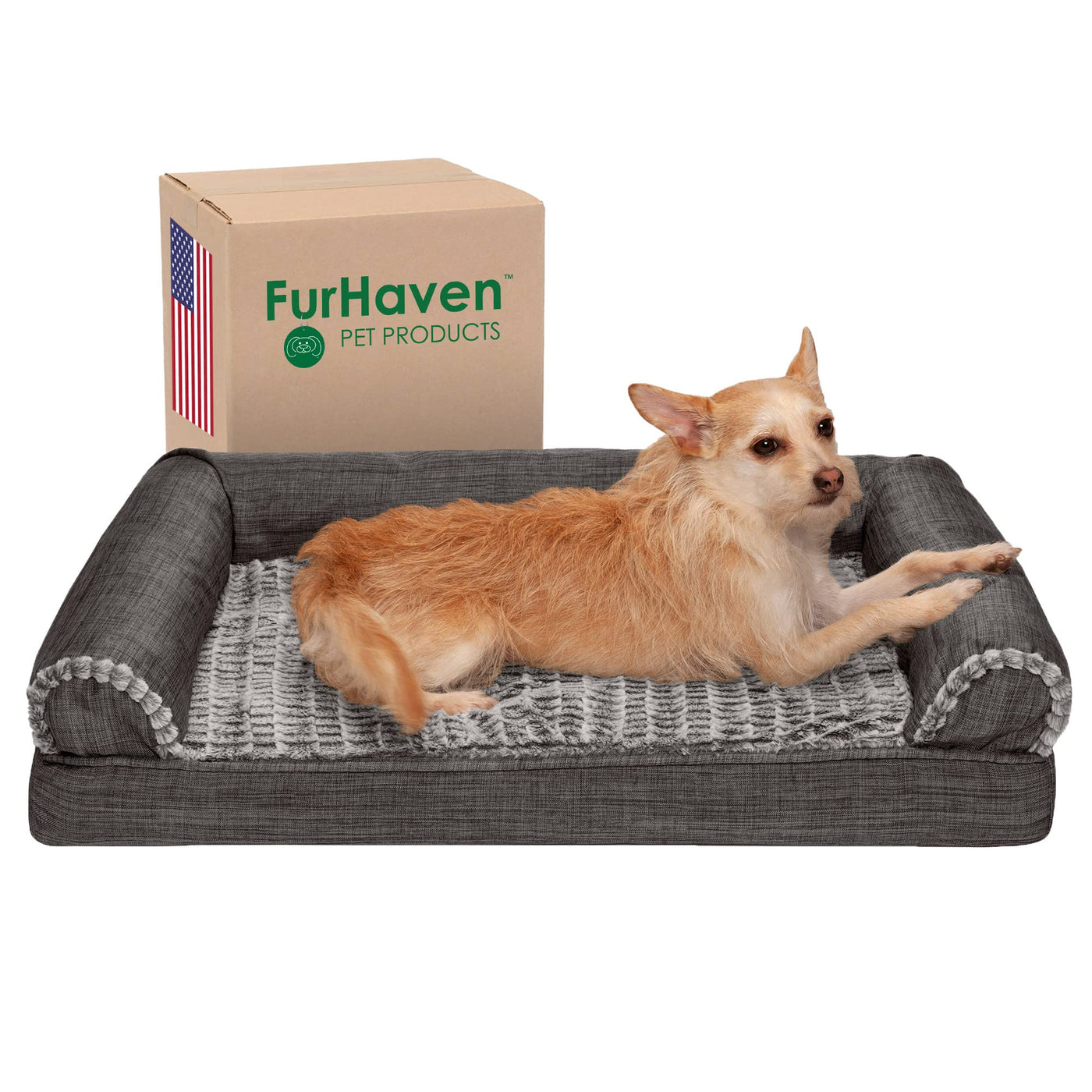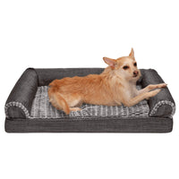 Perfect for pets young and old, the Furhaven Luxe Faux Fur & Performance Linen Sofa-Style Dog Bed is designed to provide your loved one with maximum comfort for a good night’s rest. With a soft, plush embossed sleeping surface your dog will be more snug than a bug in a rug! The orthopedic (egg crate) foam base supports your pets joints and pressure points making this pet bed ideal for arthritic pets who have trouble getting comfortable. The Jumbo Plus option, for larger breeds, features solid slab orthopedic foam for greater support and comfort. Give your companion the luxury they deserve with this orthopedic dog bed. They’ll love the linen bolsters' soft but supportive feel provided on three sides giving them a variety of cozy positions to snuggle into. The bolsters are a great pillow for your pet to lie their head on or, for pets that like to cozy into your couch, they can snuggle close to the sides for a sense of security and warmth. Whatever position your pet likes to lay in, they’ll find nothing but comfort and sweet dreams! With the feel of a couch, your pet will love having their own space to curl into while you’ll love having your favorite spot on the couch back! No more unwanted pet fur and scratches on your furniture. It’s great for older pets who may be unable to jump on the couch and have had to lie on the floor. Easy to clean. Cover care: Remove from core before washing (see seam label for fabric care instructions). Foam care: Spot clean with mild soap; rinse. Blot, then air dry. Do not wring. Not for unsupervised use by animals with chewing behaviors.