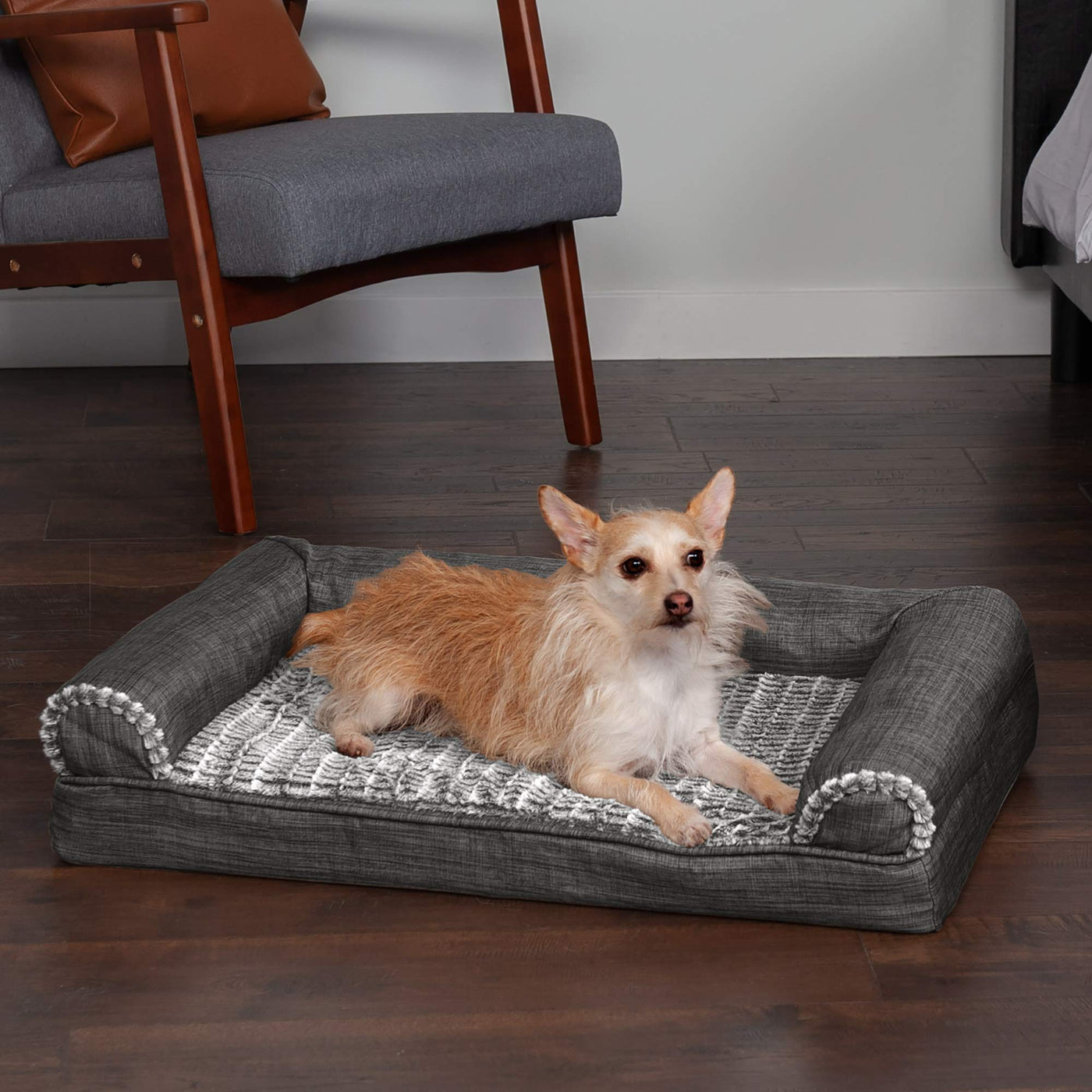 Furhaven Medium Orthopedic Dog Bed Luxe Faux Fur & Performance Linen Sofa-Style W/ Removable Washable Cover - Charcoal, Medium