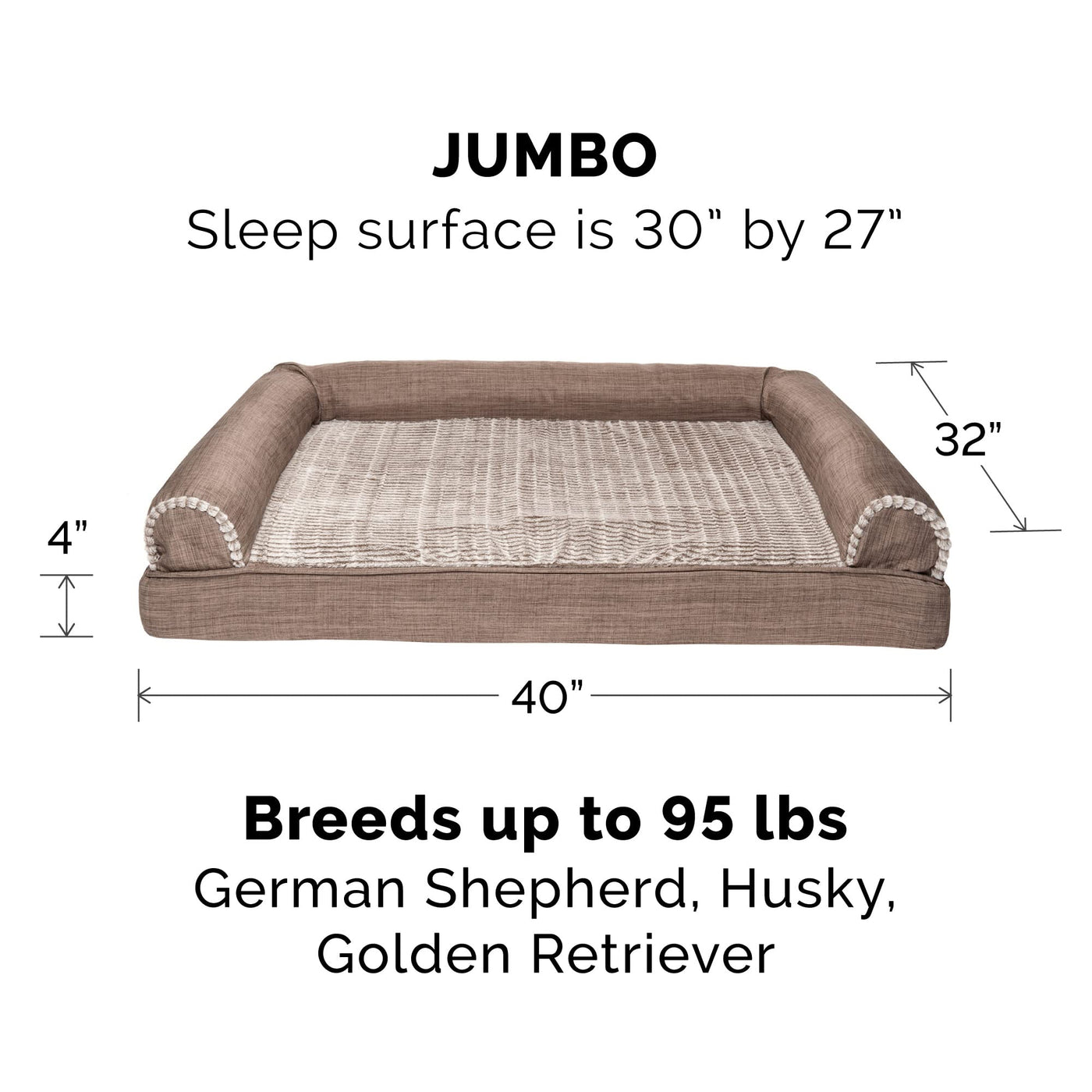 Perfect for pets young and old, the Furhaven Luxe Faux Fur & Performance Linen Sofa-Style Dog Bed is designed to provide your loved one with maximum comfort for a good nights rest. With a soft, plush embossed luxe faux fur sleeping surface your pet will be more snug than a bug in a rug! Memory foam topping is designed to work with your pets weight and contour to their body providing better overall support and relief from painful muscles and joint discomfort. Give your companion the luxury they deserve with this orthopedic dog bed. Theyll love the linen bolsters soft but supportive feel provided on three sides giving them a variety of cozy positions to snuggle into. The bolsters are a great pillow for your pet to lie their head on or, for pets that like to cozy into your couch, they can snuggle close to the sides for a sense of security and warmth. Whatever position your pooch likes to lay in, theyll find nothing but comfort and sweet dreams! With the feel of a couch, your pet will love having their own space to curl into while youll love having your favorite spot on the couch back! No more unwanted pet fur and scratches on your furniture. Its great for older pets who may be unable to jump on the couch and have had to lie on the floor. Easy to clean. Cover care: Remove from core before washing (see hang tag and/or seam label for care instructions). Foam care: Memory foam is highly absorbent. Spot clean with mild soap or enzyme-based cleaning spray. Rinse but DO NOT SOAK OR SUBMERGE. Press out moisture with a dry towel and air dry. A fan may be used to speed drying. Do not wring or place in machine dryer. Dry completely before use. Not for unsupervised use by animals with destructive chewing behavior.