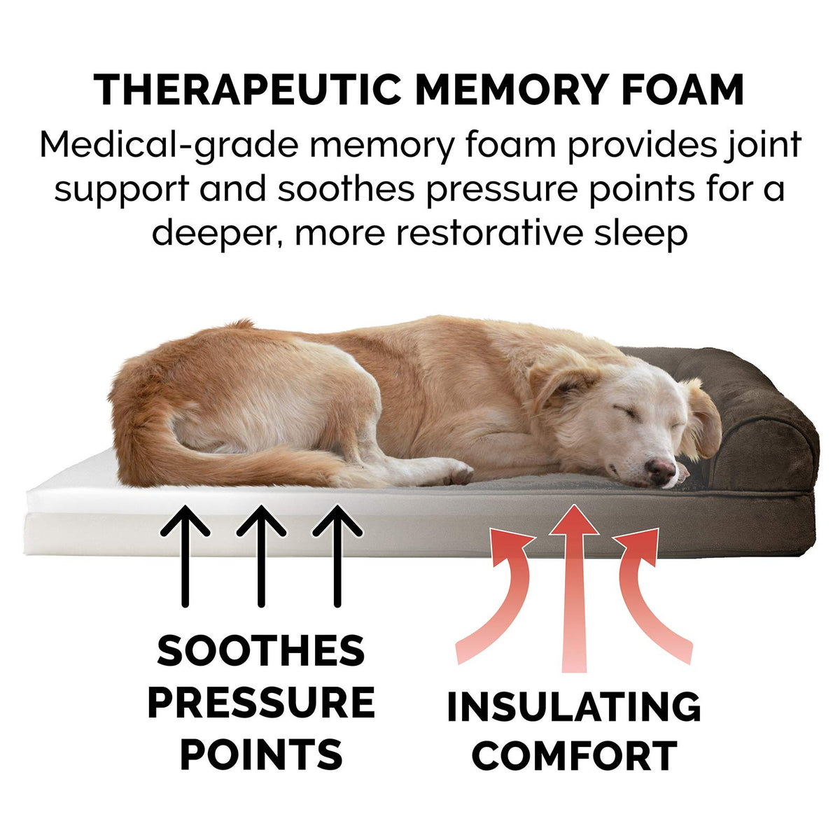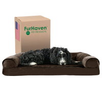 Perfect for pets young and old, the Furhaven Plush & Suede Sofa-Style Dog Bed is designed to provide your loved one with maximum comfort for a good night’s rest. With a soft, plush faux fur sleeping surface your pet will be more snug than a bug in a rug! Memory foam topping is designed to work with your pet's weight and contour to their body providing better overall support and relief from painful muscles and joint discomfort. Give your companion the luxury they deserve with this orthopedic dog bed. They’ll love the suedine bolsters' soft but supportive feel provided on three sides giving them a variety of cozy positions to snuggle into. The bolsters are a great pillow for your pet to lie their head on or, for pets that like to cozy into your couch, they can snuggle close to the sides for a sense of security and warmth. Whatever position your pooch likes to lay in, they’ll find nothing but comfort and sweet dreams! With the feel of a couch, your pet will love having their own space to curl into while you’ll love having your favorite spot on the couch back! No more unwanted pet fur and scratches on your furniture. It’s great for older pets who may be unable to jump on the couch and have had to lie on the floor. Easy to clean. Cover care: Remove from core before washing (see hang tag and/or seam label for care instructions). Foam care: Memory foam is highly absorbent. Spot clean with mild soap or enzyme-based cleaning spray. Rinse but DO NOT SOAK OR SUBMERGE. Press out moisture with a dry towel and air dry. A fan may be used to speed drying. Do not wring or place in machine dryer. Dry completely before use. Not for unsupervised use by animals with destructive chewing behavior.