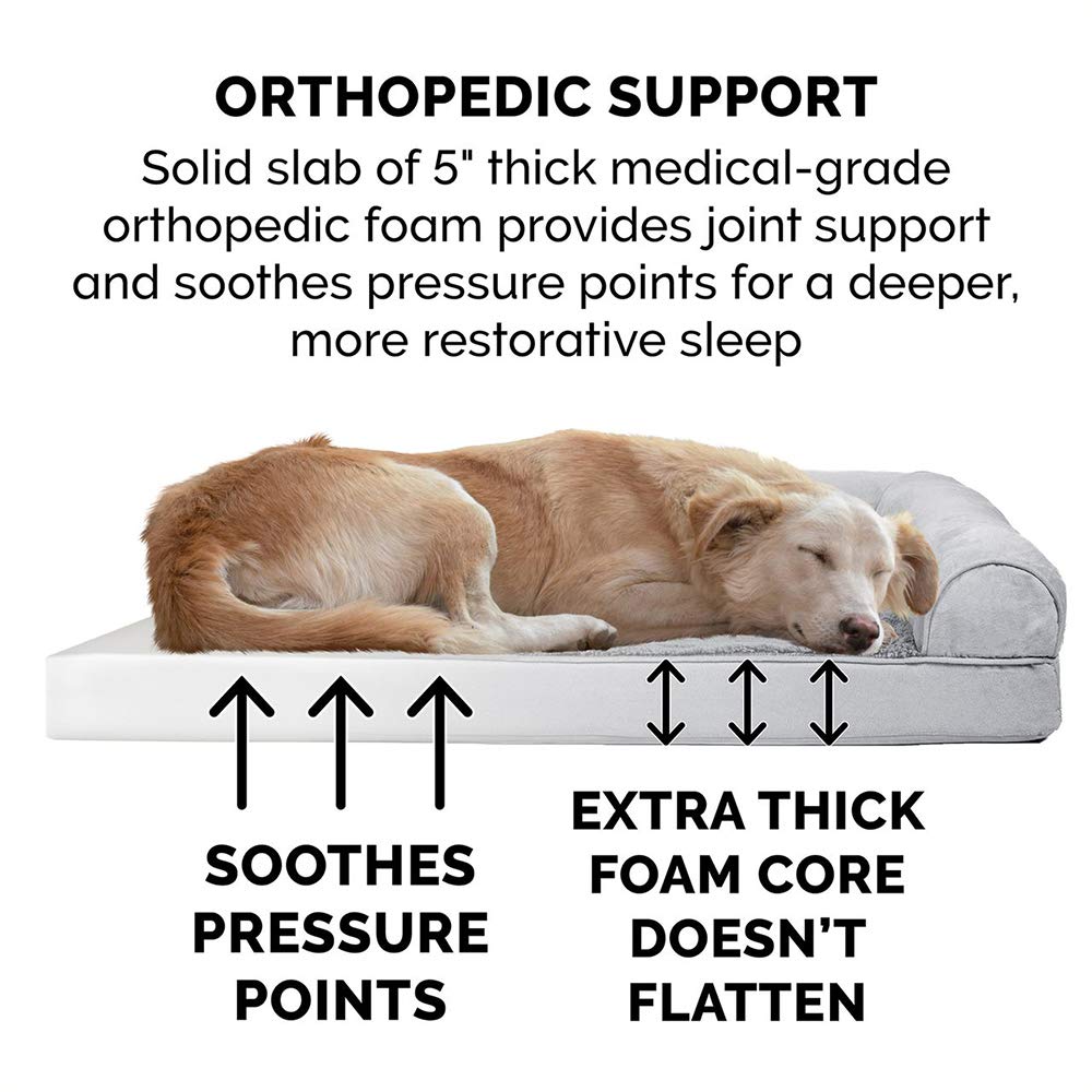 Perfect for pets young and old, the Furhaven Plush & Suede Sofa-Style Dog Bed is designed to provide your loved one with maximum comfort for a good night’s rest. With a soft, plush faux fur sleeping surface your dog will be more snug than a bug in a rug! The orthopedic (egg crate) foam base supports your pets joints and pressure points making this pet bed ideal for arthritic pets who have trouble getting comfortable. The Jumbo Plus option, for larger breeds, features solid slab orthopedic foam for greater support and comfort. Give your companion the luxury they deserve with this orthopedic dog bed. They’ll love the suedine bolsters' soft but supportive feel provided on three sides giving them a variety of cozy positions to snuggle into. The bolsters are a great pillow for your pet to lie their head on or, for pets that like to cozy into your couch, they can snuggle close to the sides for a sense of security and warmth. Whatever position your pet likes to lay in, they’ll find nothing but comfort and sweet dreams! With the feel of a couch, your pet will love having their own space to curl into while you’ll love having your favorite spot on the couch back! No more unwanted pet fur and scratches on your furniture. It’s great for older pets who may be unable to jump on the couch and have had to lie on the floor. Easy to clean. Cover care: Remove from core before washing (see seam label for fabric care instructions). Foam care: Spot clean with mild soap; rinse. Blot, then air dry. Do not wring. Not for unsupervised use by animals with chewing behaviors.