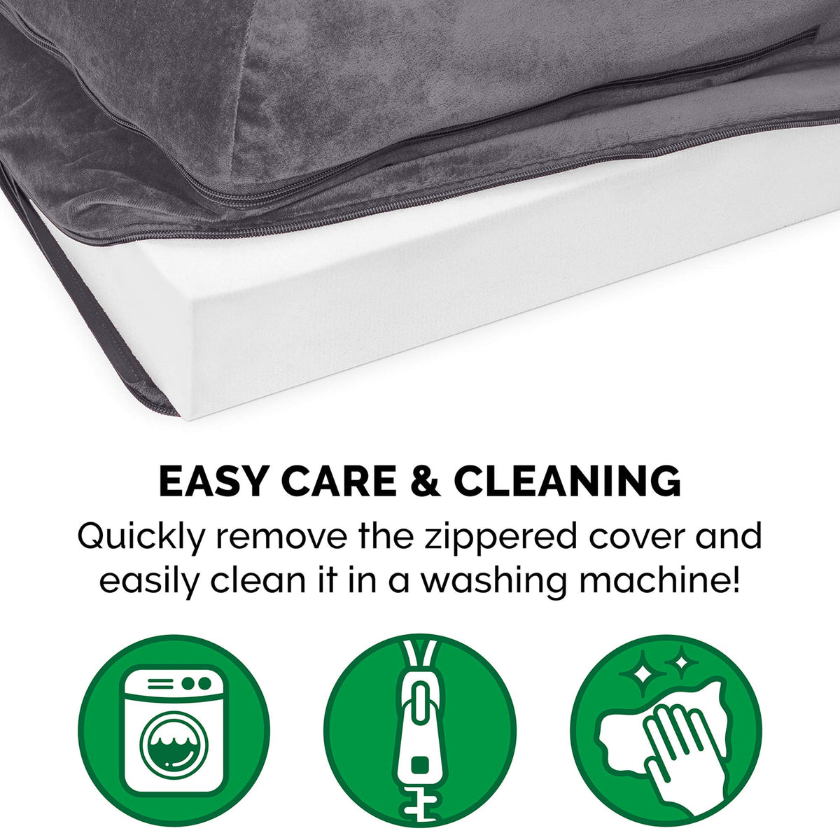 Pamper your pet with a new Furhaven Plush & Velvet L Chaise Dog Bed! A luxuriously soft plush sleep surface is complemented by velvet covered bolsters and gusset. Ultra-plush faux fur provides a snuggly soft sleep surface and trims the edges of the bolster for a chic flair. The L-shaped bolsters support your pet’s back and hips, providing additional support. The L-shape also provides the perfect nook for pets that like to nest into comfort. The two raised, rounded bolster ends allow your pet to lay their paws or neck on the pillowed edge, helping to align the neck and spine. An orthopedic foam base features egg-crate foam that alleviates aching joints and provides soothing comfort to pressure points. The Jumbo Plus option, for larger breeds, features solid slab orthopedic foam for greater support and comfort. The zippered cover is easily removed and machine washable for your convenience. Available in various stylish colors and diverse sizing options so your pet can sprawl and lounge the day in maximum comfort and style. Easy to clean. Cover care: Remove from core before washing (see seam label for fabric care instructions). Foam care: Spot clean with mild soap; rinse. Blot, then air dry. Do not wring. Not for unsupervised use by animals with chewing behaviors.