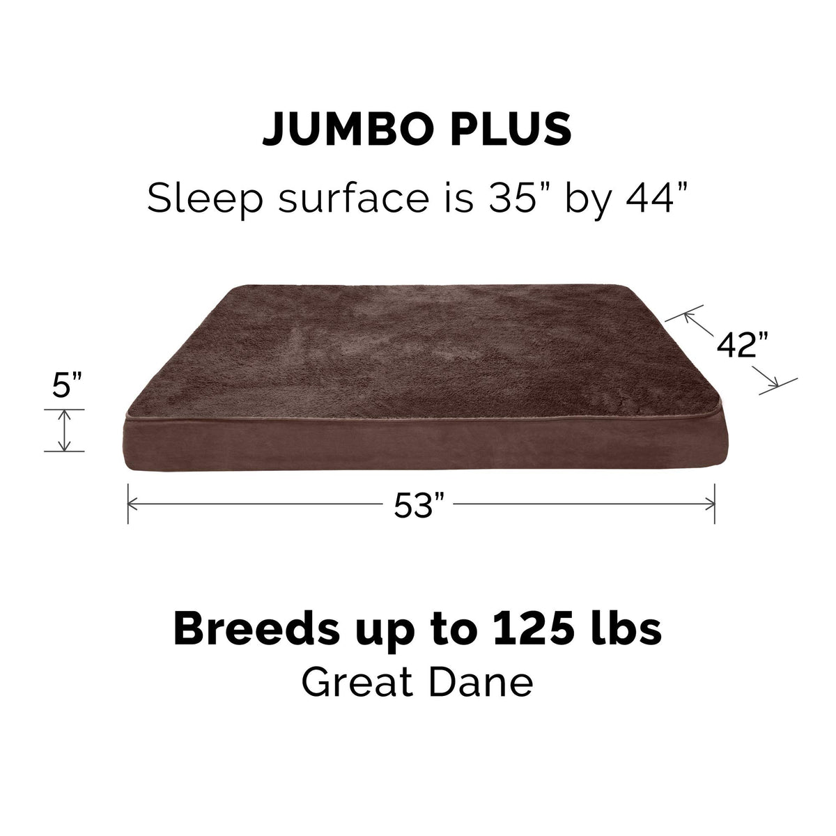 Q: What is the size of the Furhaven Orthopedic Dog Bed?A: The Furhaven Orthopedic Dog Bed in Jumbo Plus size measures 53 inches in length, 40 inches in width, and 9.5 inches in thickness, making it suitable for large dogs up to 125 lbs.