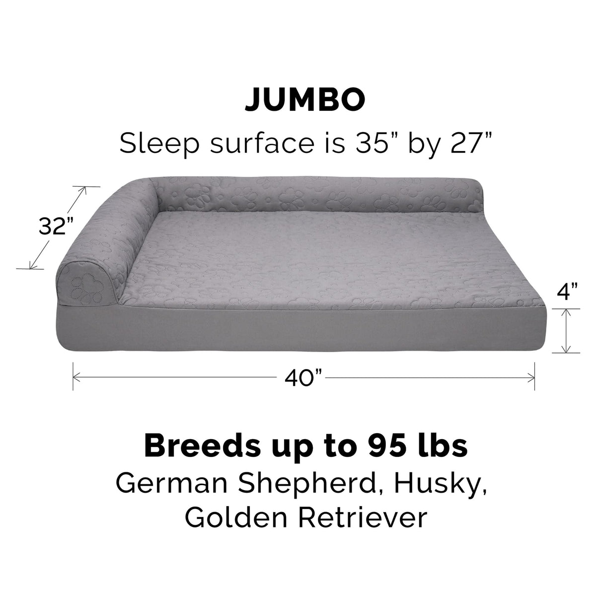 Q: What are the dimensions of the Furhaven Orthopedic Dog Bed?A: The Furhaven Orthopedic Dog Bed in Jumbo size measures 40" in length, 32" in width, and has a thickness of 8". The sleep surface is approximately 35" x 27".
