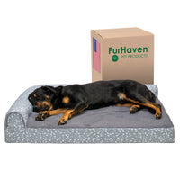 Pamper your pet with a new Furhaven Plush & Almond Print L Shaped Chaise Dog Bed! The sleep surface is lined with soft plush faux fur for cozy nighttime snuggles. The L-shaped bolsters support your pet’s back and hips, providing additional support. The L-shape also provides the perfect nook for pets that like to nest into comfort. The two raised, rounded bolster ends allow your pet to lay their paws or neck on the pillowed edge, helping to align the neck and spine. The orthopedic (egg crate) foam base supports your pet's joints, cushions pressure points, and helps improve air circulation for optimum rest. The Jumbo Plus option, for larger breeds, features a solid slab orthopedic foam for greater support and comfort. The zippered cover is easily removed and machine washable for your convenience. Low profile, step-on design for easy access by older or disabled pets. Easy to clean. Cover care: Remove from core before washing (see seam label for fabric care instructions). Foam care: Spot clean with mild soap; rinse. Blot, then air dry. Do not wring. Not for unsupervised use by animals with chewing behaviors.