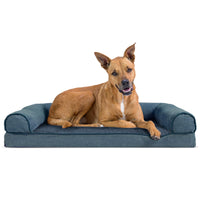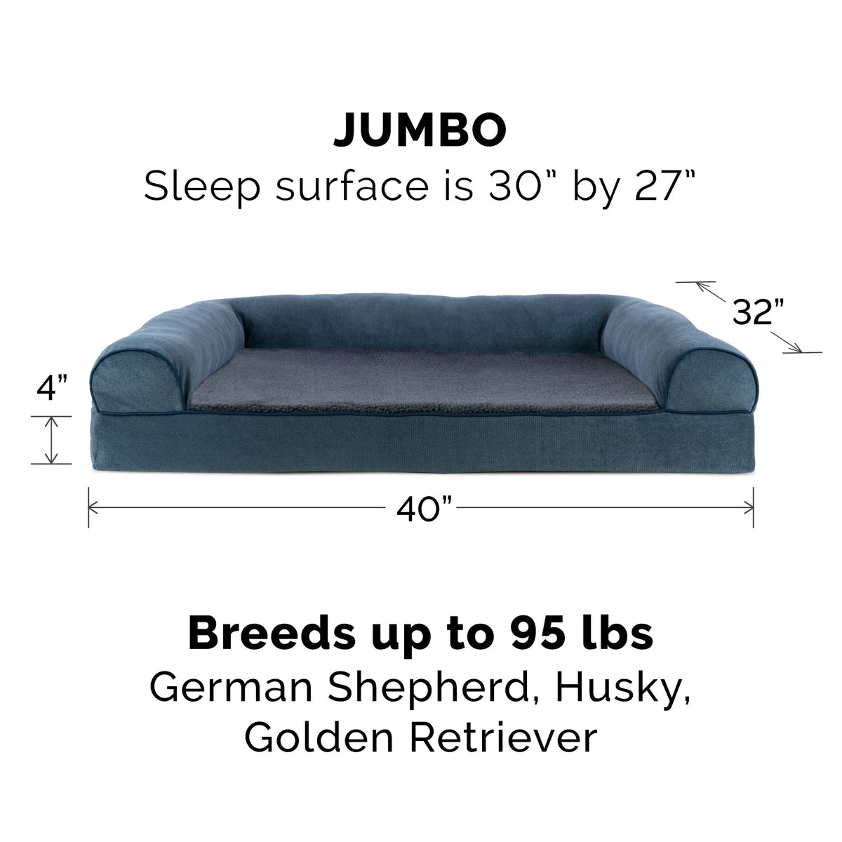 Finally, a solution for your arthritic pet's pain! This Furhaven Sherpa & Chenille Sofa-Style Dog Bed has a soft, faux fleece sleep surface providing your pet comfort while the orthopedic (egg crate) foam base supports your dog's joints and pressure points. The Jumbo Plus option, for larger breeds, features solid slab orthopedic foam for greater support and comfort. The sofa bed has three walls to give your pup a variety of positions to lay in while remaining comfortable. Your best friend deserves a good night’s rest and now, it’s possible. With their very own orthopedic pet bed, your loved one will have maximum comfort for a great night's rest. Any position will do on this sofa bed! The squishy bolsters on three sides provide comfort for your pet to lay down in a variety of ways while always being provided the support they need. For example, your dog can lay on their tummy and use one of the bolsters as a pillow for a cozy night of sweet dreams. Cats love our sofa beds also! The bolsters provide cozy walls for your feline friend to snuggle into for their cat naps. This luxurious orthopedic pet couch provides a cozy spot for your companion to snuggle up in, leaving your favorite spot on the couch all for you! Easy to clean. Cover care: Remove from core before washing (see seam label for fabric care instructions). Foam care: Spot clean with mild soap; rinse. Blot, then air dry. Do not wring. Not for unsupervised use by animals with chewing behaviors.
