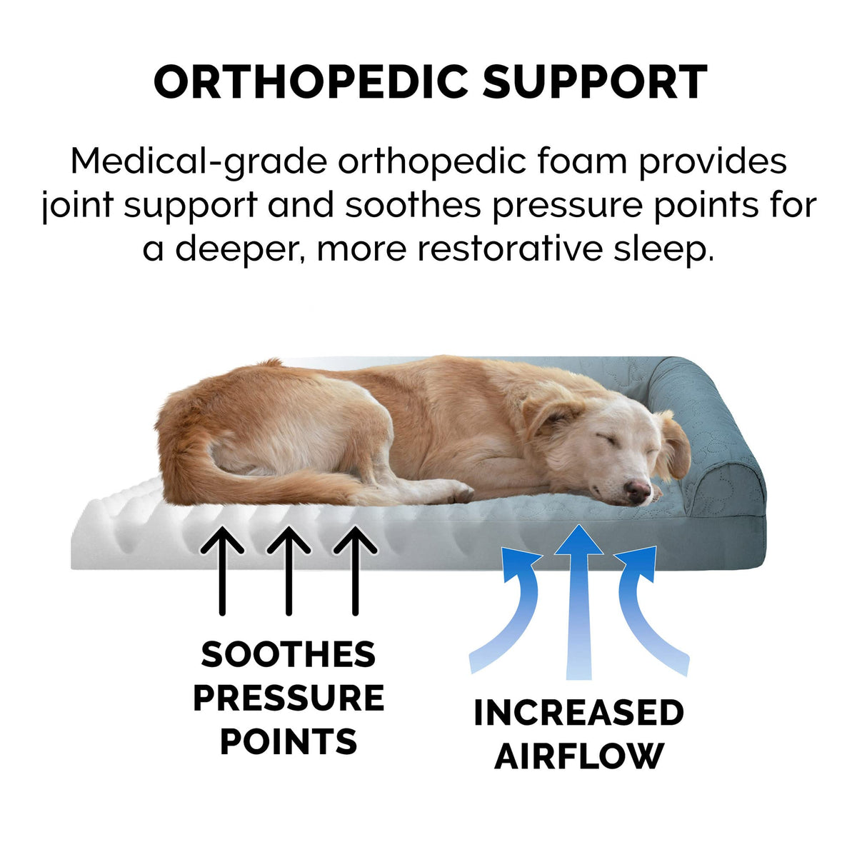 Pamper your pet with a new Furhaven Pinsonic Quilted Paw L Chaise Dog Bed! The smooth sleep surface is soft and perfect for nighttime snuggles; featuring a stylish quilted design to complement any room of your house. The L-shaped bolsters support your pet’s back and hips, providing additional support. The L-shape also provides the perfect nook for pets that like to nest into comfort. The two raised, rounded bolster ends allow your pet to lay their paws or neck on the pillowed edge, helping to align the neck and spine. An orthopedic foam base features egg-crate foam that alleviates aching joints and provides soothing comfort to pressure points. The zippered cover is easily removed and machine washable for your convenience. Available in various stylish colors and diverse sizing options so your pet can sprawl and lounge the day in maximum comfort and style. Low profile, step-on design for easy access by older or disabled pets. Easy to clean. Cover care: Remove from core before washing (see seam label for fabric care instructions). Foam care: Spot clean with mild soap; rinse. Blot, then air dry. Do not wring. Not for unsupervised use by animals with chewing behaviors.