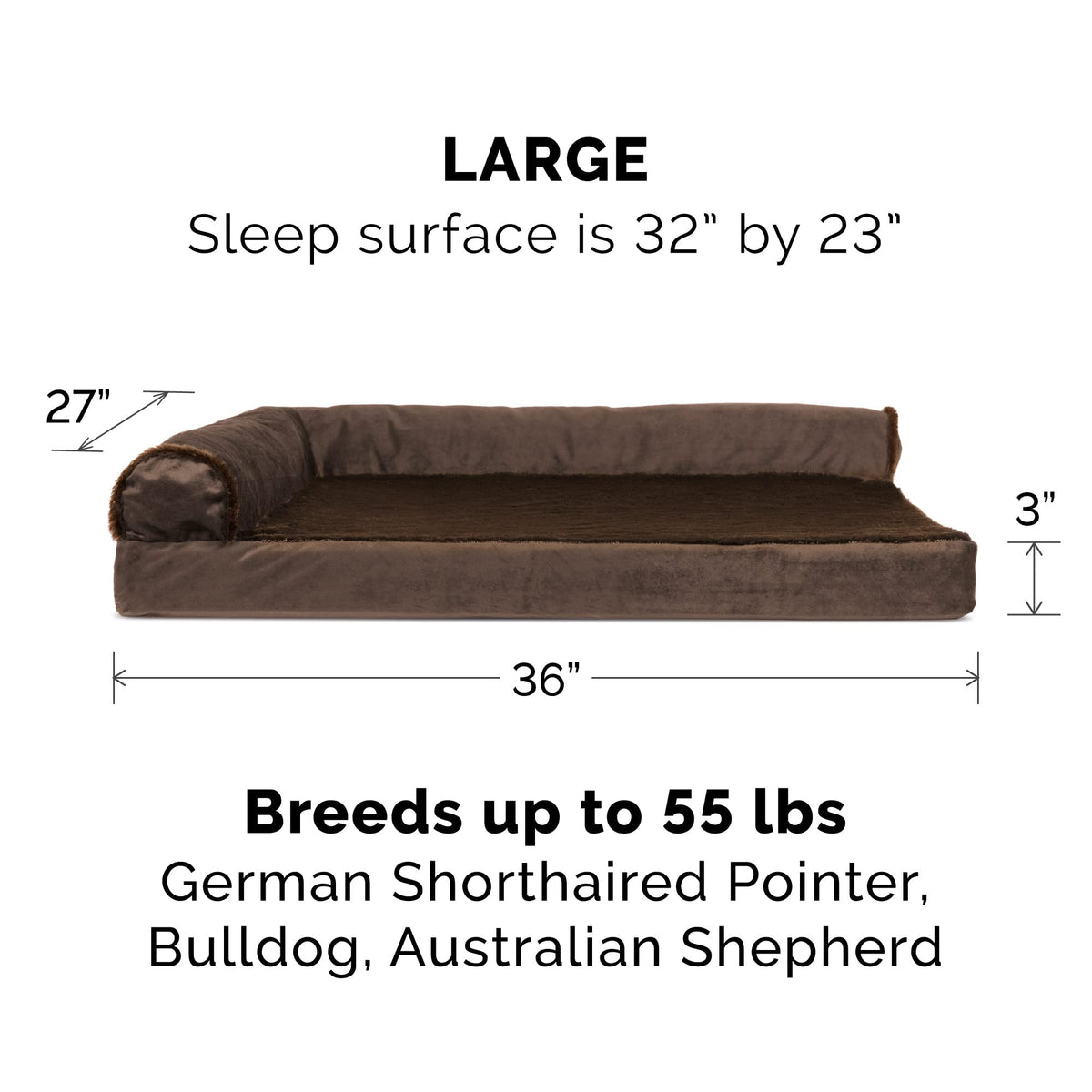 Pamper your pet with a new Furhaven Plush & Velvet L Chaise Dog Bed! A luxuriously soft plush sleep surface is complemented by velvet covered bolsters and gusset. Ultra-plush faux fur provides a snuggly soft sleep surface and trims the edges of the bolster for a chic flair. The L-shaped bolsters support your pet’s back and hips, providing additional support. The L-shape also provides the perfect nook for pets that like to nest into comfort. The two raised, rounded bolster ends allow your pet to lay their paws or neck on the pillowed edge, helping to align the neck and spine. An orthopedic foam base features egg-crate foam that alleviates aching joints and provides soothing comfort to pressure points. The Jumbo Plus option, for larger breeds, features solid slab orthopedic foam for greater support and comfort. The zippered cover is easily removed and machine washable for your convenience. Available in various stylish colors and diverse sizing options so your pet can sprawl and lounge the day in maximum comfort and style. Easy to clean. Cover care: Remove from core before washing (see seam label for fabric care instructions). Foam care: Spot clean with mild soap; rinse. Blot, then air dry. Do not wring. Not for unsupervised use by animals with chewing behaviors.