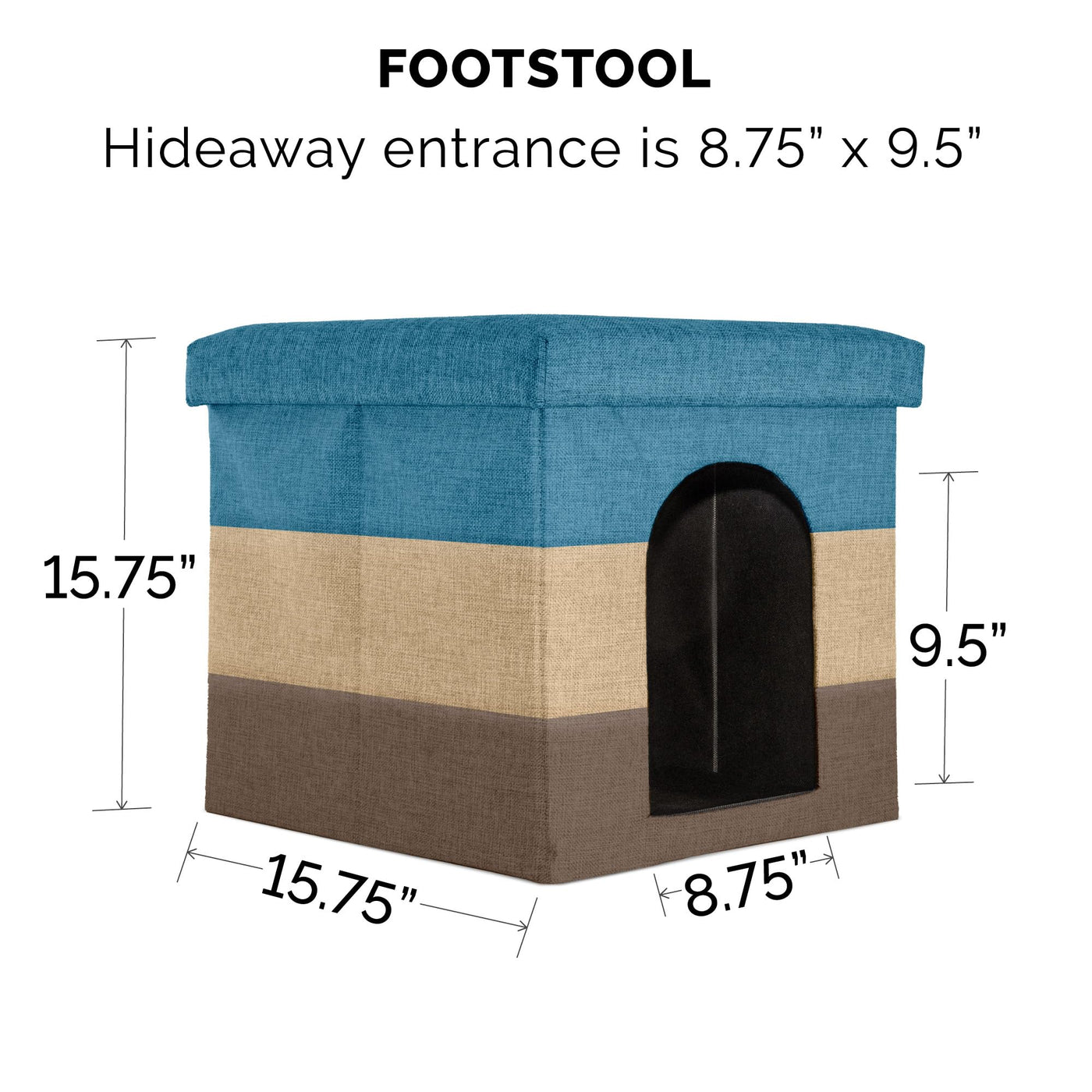 Achieve the ultimate combination of household harmony with Furhaven Collapsible Ottoman Footstool Pet House. Seamlessly integrate your pets hideout into your daily life in both style and comfort. Featuring a simple but innovative pop-up design, the collapsible pet house lets your favorite furball be in the middle of the action without being the center of attention! Available in various color options to blend with a variety of home decors, these innovative cubbies are the perfect hideaway for curious cats and shy dogs. Inside the easy-care canvas walls there is a private space and a soft fleece-covered base (removable and washable) for your pets comfort. All you need is their favorite toy and a soft blankie to achieve pet purr-fection! (Optional hanging ball toy is included for your feline friends - or pups who are feline-inclined.) This houses padded top provides extra insulating comfort by trapping your pets natural body heat to create a cozy haven for your dog or cat. Not just for your pet - this ottoman is a great spot to rest your feet and is sturdy enough to support 130-pounds of static weight! Going on a family trip? This pet house is easy to take along and creates an instant and familiar space for your dog or cat when boarding or visiting friends. Exterior is hand wash only. The pet house sets up in seconds by simply unfolding the walls, inserting the base panel and placing the lid on top. Pro tip! Place your pets favorite soft object or blanket in the footstool for extra padding and to encourage use!