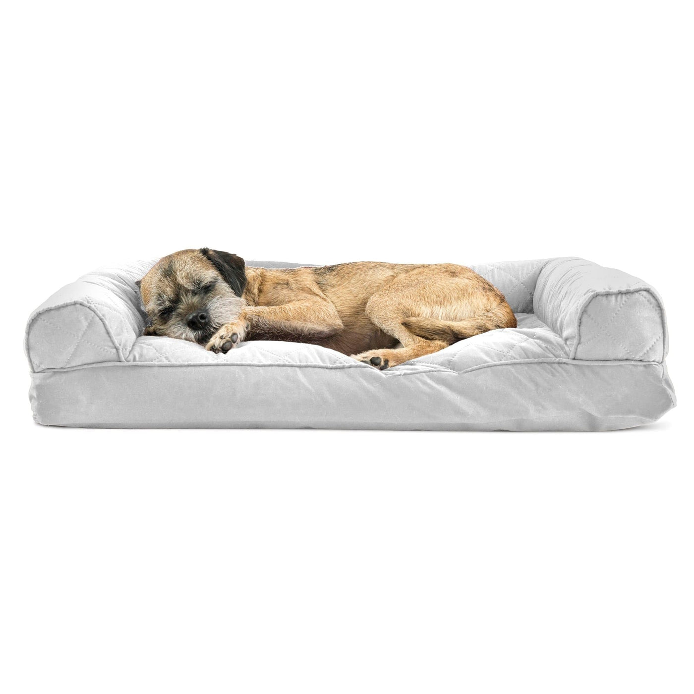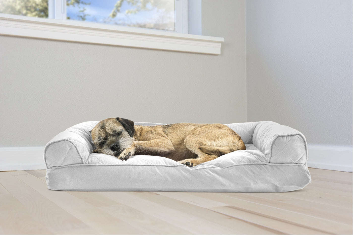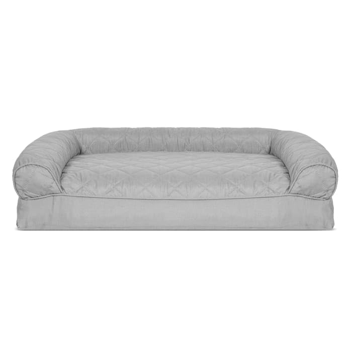 Perfect for pets young and old, the Furhaven Quilted Sofa-Style Dog Bed is designed to provide your loved one with maximum comfort for a good night’s rest. With a smooth, quilted sleeping surface your dog will be more snug than a bug in a rug! Your pet will love the high-loft comfort of this fiber-filled pillow dog couch which is gusseted for maximum loft and comfort. They’ll love the bolsters' soft but supportive feel provided on three sides giving them a variety of cozy positions to snuggle into. The bolsters are a great pillow for your pet to lie their head on or, for pets that like to cozy into your couch, they can snuggle close to the sides for a sense of security and warmth. Whatever position your pet likes to lay in, they’ll find nothing but comfort and sweet dreams! With the feel of a couch, your pet will love having their own space to curl into while you’ll love having your favorite spot on the couch back! No more unwanted pet fur and scratches on your furniture. It’s great for older pets who may be unable to jump on the couch and have had to lie on the floor. The sofa-style pillow pet bed provides the comfort of a couch without the struggle of getting up there! This deluxe pillow sofa pet bed was also made with you in mind and is available in various stylish colors so you’re sure to find the perfect match for your current decor! For your pet, we offer diverse sizing options so that you can make sure your pet has enough room to fit their preferences for maximum comfort. With a removable and washable cover, this sofa bed is easy to clean! Sleeping has never been so enjoyable for your pet in this deluxe sofa-style pillow bed. Your pet won’t need to count sheep to fall soundly asleep on this cozy bed!