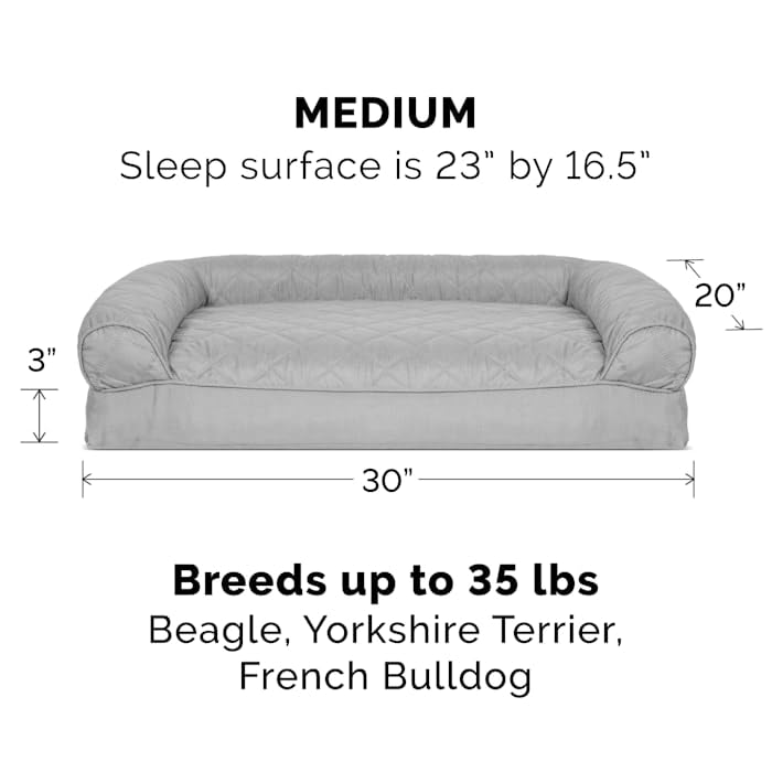 Furhaven Pillow Dog Bed For Medium/Small Dogs W/ Removable Bolsters & Washable Cover - Quilted Sofa - Silver Gray, Medium