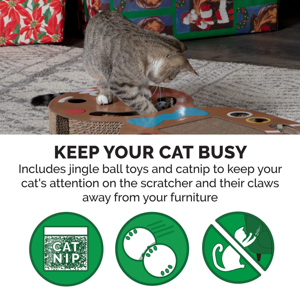 BIG fun for the holidays and all year-round, Furhaven's Giant Gingerbread Man Corrugated Cat Scratcher Busy Box is twice the size of other busy box cat toys! Perfect for multi-cat households, this combo ball puzzle and scratcher features multiple play and scratch zones. Attention-grabbing jingle ball toys weave in and out of view behind colorful cutouts to keep your cat engaged. This sweet, oversized cookie man also features a corrugated belly to encourage your cat to scratch (and keep their claws away from expensive furniture). Includes catnip to entice even the most finicky felines to play.