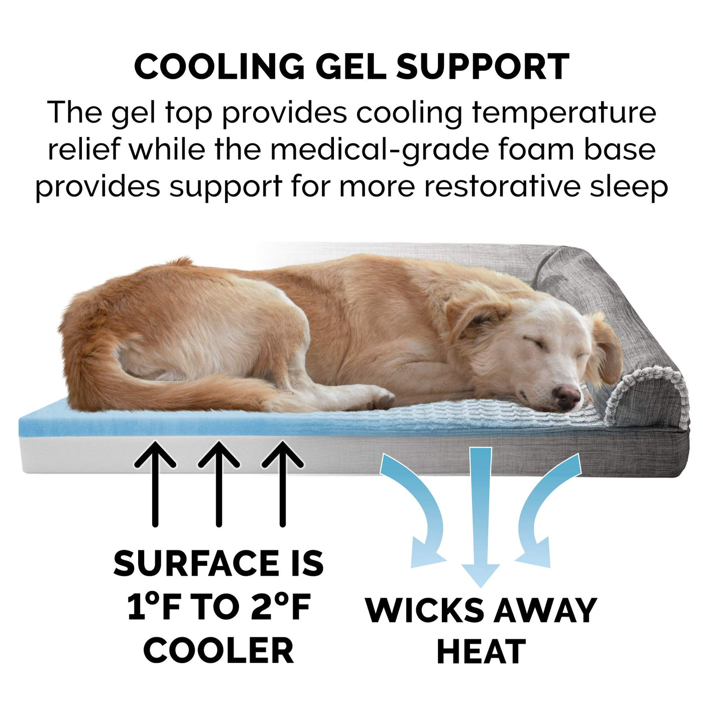 Perfect for pets young and old, the Furhaven Luxe Faux Fur & Performance Linen Sofa-Style Dog Bed is designed to provide your loved one with maximum comfort for a good night’s rest. With a soft, plush embossed faux fur sleeping surface your pet will be more snug than a bug in a rug! The medical-grade foam core includes a layered orthopedic foam core topped with gel-infused memory foam. Micro gel beads help keep the bed cooler while memory foam conforms to your pet's shape providing superior support of joints and pressure points. Gel foam has cooling properties reducing the sleeping surface by 1- or 2-degrees, wicking heat away from your pet. The superior support provided by both foam cores will help your pet reach a deeper, more restorative rest for your pet's health. These are the perfect dog beds for hot summer days. They’ll love the linen bolsters' soft but supportive feel provided on three sides giving them a variety of cozy positions to snuggle into. The bolsters are a great pillow for your pet to lie their head on or, for pets that like to cozy into your couch, they can snuggle close to the sides for a sense of security and warmth. Whatever position your pooch likes to lay in, they’ll find nothing but comfort and sweet dreams! With the feel of a couch, your pet will love having their own space to curl into while you’ll love having your favorite spot on the couch back! No more unwanted pet fur and scratches on your furniture. It’s great for older pets who may be unable to jump on the couch and have had to lie on the floor. Easy to clean. Cover care: Remove from core before washing (see seam label for fabric care instructions). Foam care: Cooling gel foam is highly absorbent. Spot clean with mild soap or enzyme-based cleaning spray. Rinse but DO NOT SOAK OR SUBMERGE. Press out moisture with a dry towel and air dry. A fan may be used to speed drying. Do not wring or place in machine dryer. Dry completely before use. Not for unsupervised use by animals with destructive chewing behavior.