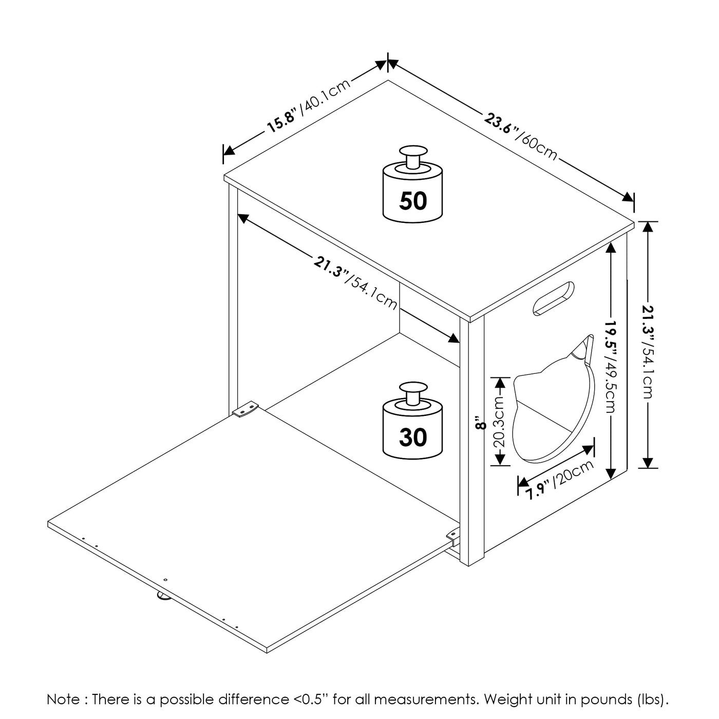 Q: What are the dimensions of the Furinno Peli Small Cat Litter Box Enclosure?A: The Furinno Peli Small Cat Litter Box Enclosure measures 23.62 inches in width, 21.26 inches in height, and 15.75 inches in depth, making it a compact solution for small spaces.