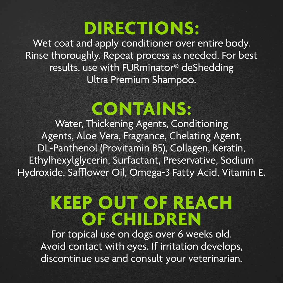 Take your grooming routine into your own hands by implementing the FURminator Ultimate Hair Reduction System: Brush, deShed, Bathe and Maintain for grooming confidence in the comfort of your own home. Our deShedding tools, grooming tools and hair solutions offer a grooming regimen catered to any dog or cat. The FURminator deShedding Ultra Premium Conditioner is formulated with multiple conditioning agents that, when used with our deShedding Tools, offers a complete system for deShedding, cleansing and conditioning. Enriched with Omega three and six fatty acids, this moisturizing formula helps reduce excess shedding and promotes healthy skin and coat for your pup. Plus, its formulated without parabens or chemical dyes. Even better, the OdorCapture 360 Technology helps remove the wet dog smell - which means youll want to cuddle up to your fresh and furry friend. The FURminator Ultimate Hair Reduction System has four steps for a complete at-home grooming regimen. Regular shampooing and conditioning promotes healthy skin and coat. To use, wet coat and apply conditioner over entire body. Repeat process as needed. For best results, use with FURminator deShedding Ultra Premium Shampoo.