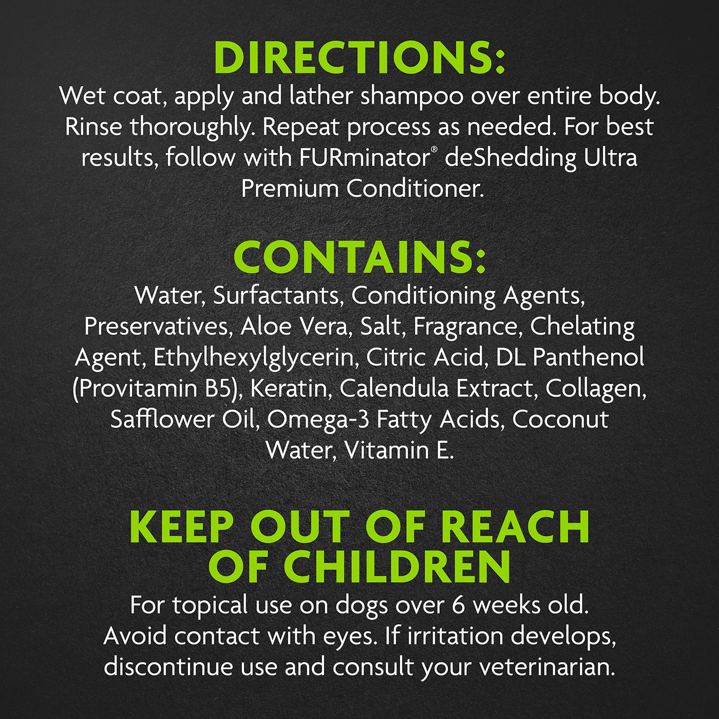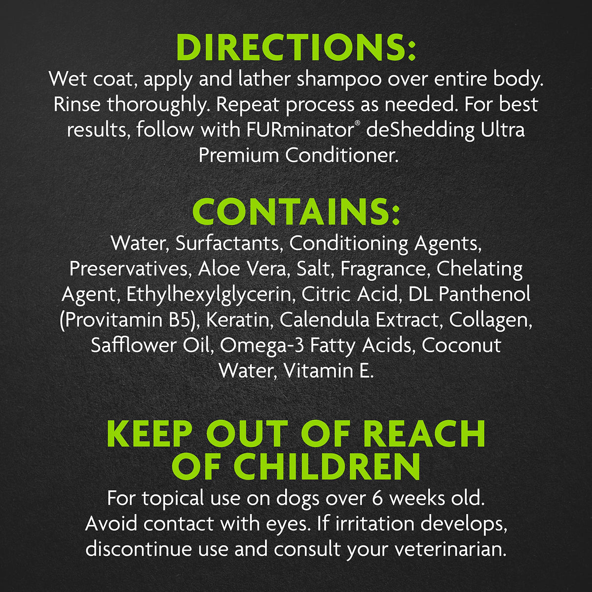 Q: How do I use the FURminator deShedding Ultra Premium Shampoo for best results?A: To use the FURminator deShedding Ultra Premium Shampoo, wet your dog's coat thoroughly, apply the shampoo evenly over the entire body, and lather. Rinse well and repeat as needed. For optimal results, follow up with the FURminator deShedding Ultra Premium Conditioner.