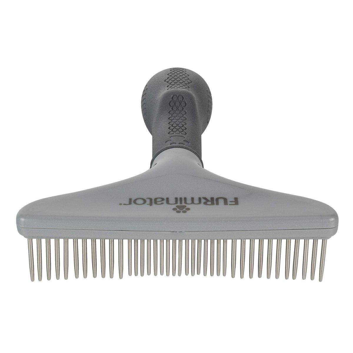 Q: What is the ergonomic design feature of the FURminator Grooming Rake?A: The FURminator Grooming Rake features an ergonomic non-slip handle that provides maximum control during grooming. This design allows for comfortable use, minimizing hand fatigue while efficiently grooming your pet.