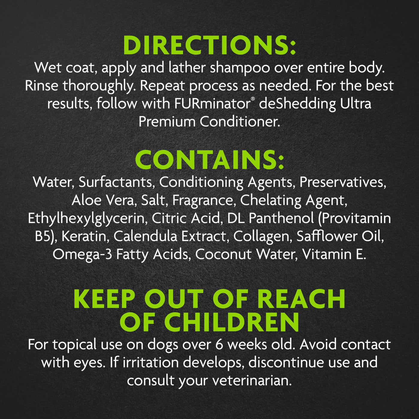Q: How does the FURminator Ultra Premium deShedding Shampoo help reduce shedding?A: The FURminator Ultra Premium deShedding Shampoo is specifically formulated with multiple conditioning agents that help strengthen and nourish your dog's skin and coat. When used in conjunction with FURminator deShedding tools, it creates a complete system designed to effectively reduce excess shedding.