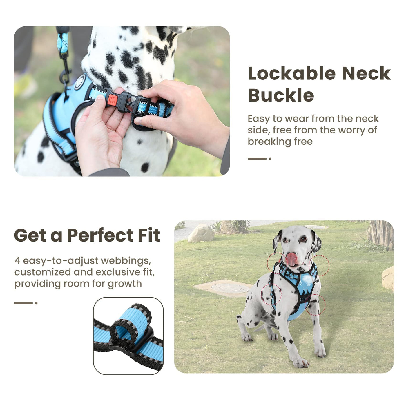 o Pull FURRYFEcTION dog harness features 2 metal leash rings one on the back and the other on the chest The front D-Ring helps redirect your dogs forward motion and the back ring is perfect for a casual dog walk jogging hiking training o choke 4 adjustable straps are created to fit various dogs with different body shapes With 2 easy buckles on belly straps and 1 more lockable quick release buckle on the neckline you donAt need to slip over the dogAs head to adjust the straps all the time Easy control handle gives pet owners additional control et-friendly Material Our durable dog vest is made of 600D Nylon with sturdy stitching suitable for long-time use Breathable mesh design keeps air circulation around your dogAs body and protects your dogAs skin during outdoor activities Reflective straps guarantee you a safe and wonderful late-night walk Size Matters We provide different size harnesses for small dogs to large dogs to ensure your dog a comfortable experience Note: Please measure your dogAs neck girth& chest girth carefully and check our measuring guide before purchasing There might be a slight difference If your dog fits two sizes in the list always choose the larger one Otherwise contact us and we will give you some advice customer Service Our customersA amazing shopping experience is always our Priority If you have any problems while using our products please feel free to let us know Our customer service will effectively solve your problem in 24 hours