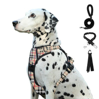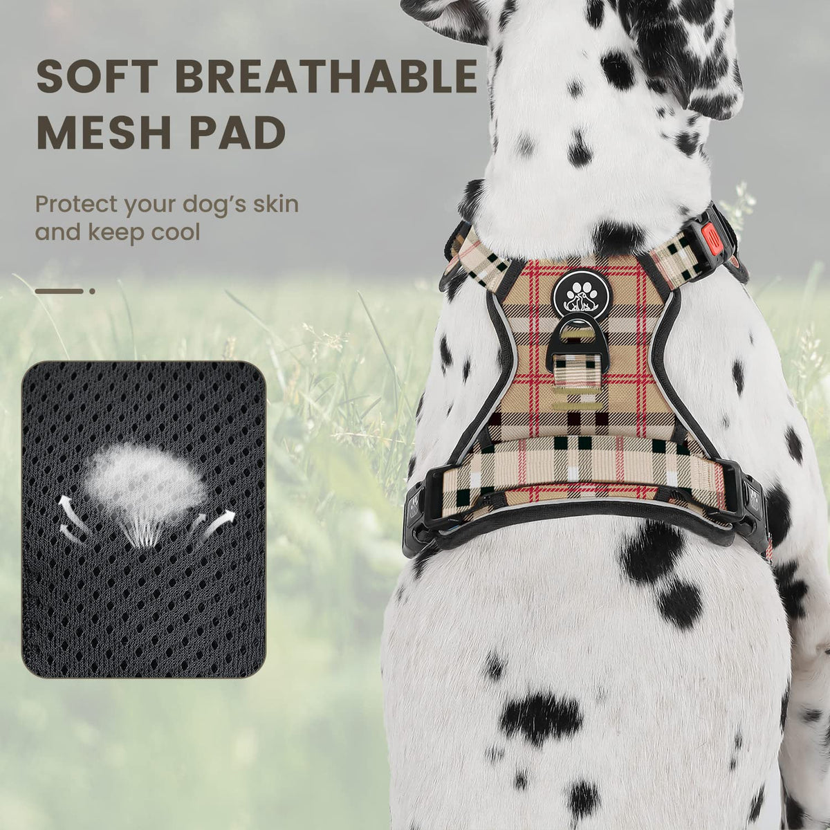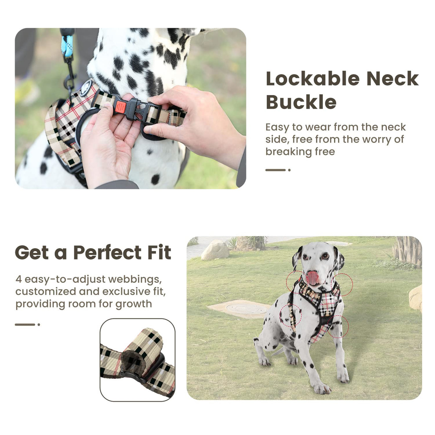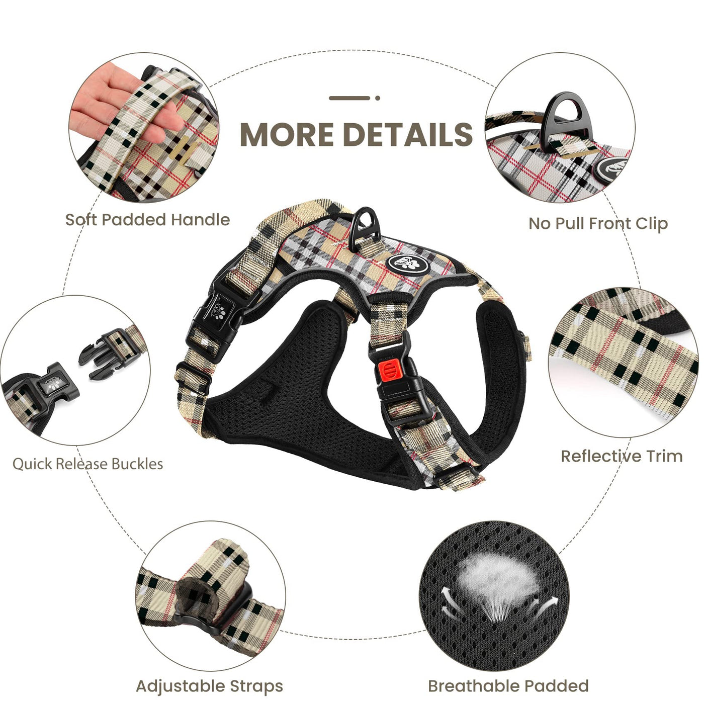 Furryfection Plaid Dog Harness For Large Dogs | No Pull Reflective Pet Harness | No Choke Adjustable Dog Vest Harnesses | With Leash | Easy Control Handle | Front Lead | Seat Belt | Beige&White | Xl