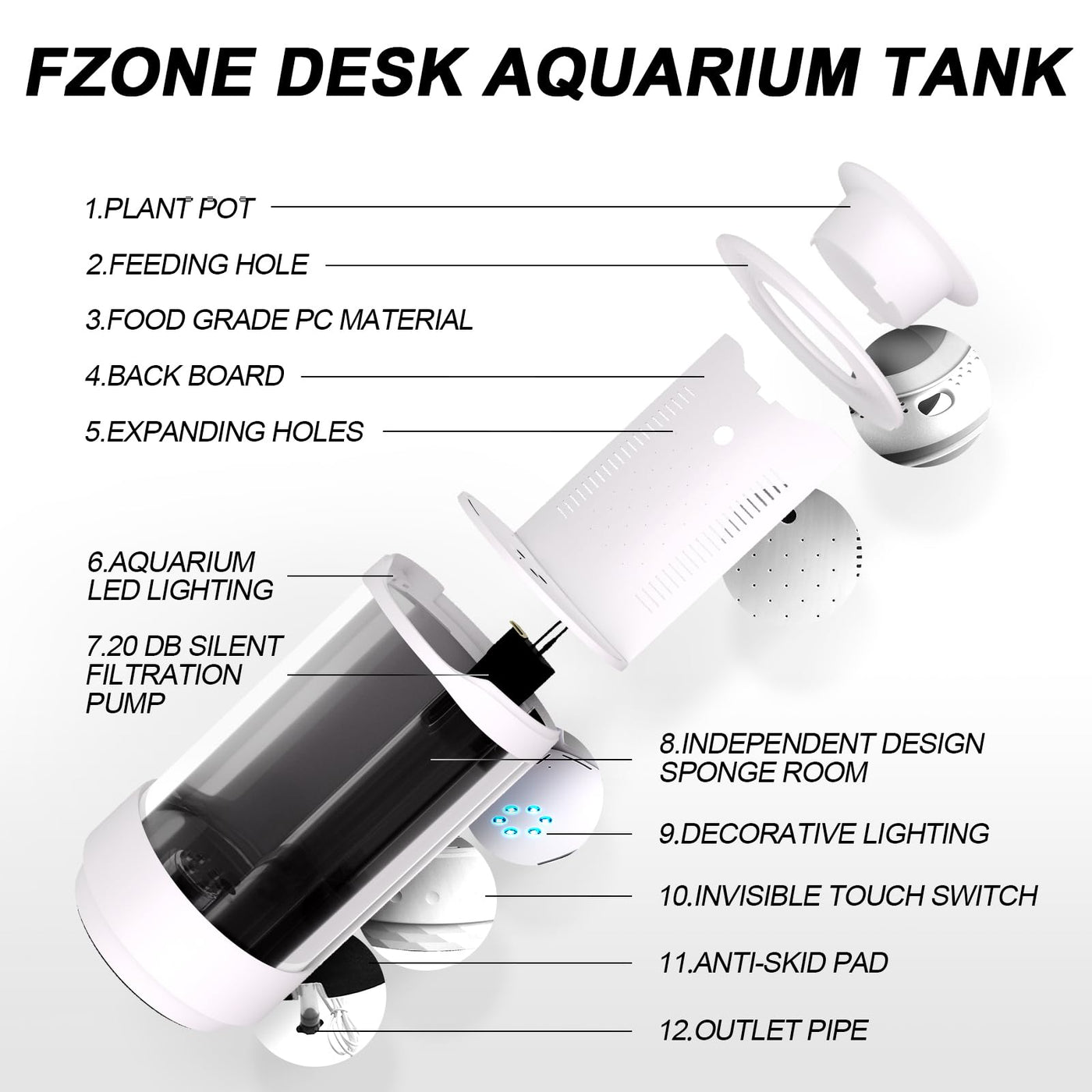 Fzone 1.2Gal Small Fish Tank With Plant Pot, All-In-One Desktop Aquarium Kit With Adjustable 4 Color Light Modes,20Db Filtration