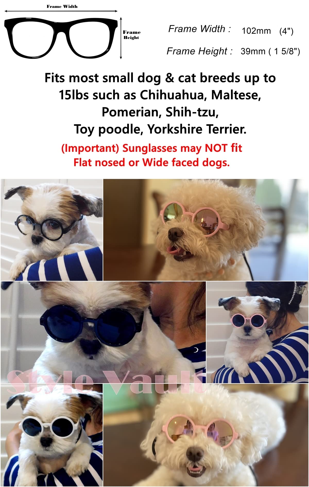 Fits most small dog breeds up to 15lbs such as Chihuahua Maltese Pomerian Shih-tzu Toy poodle Yorkshire Terrier. (Important) Sunglasses may NOT fit Flat nosed or Wide faced dogs. Fits small dogs and cats up to 15lbs (Teacup & Toy breeds)