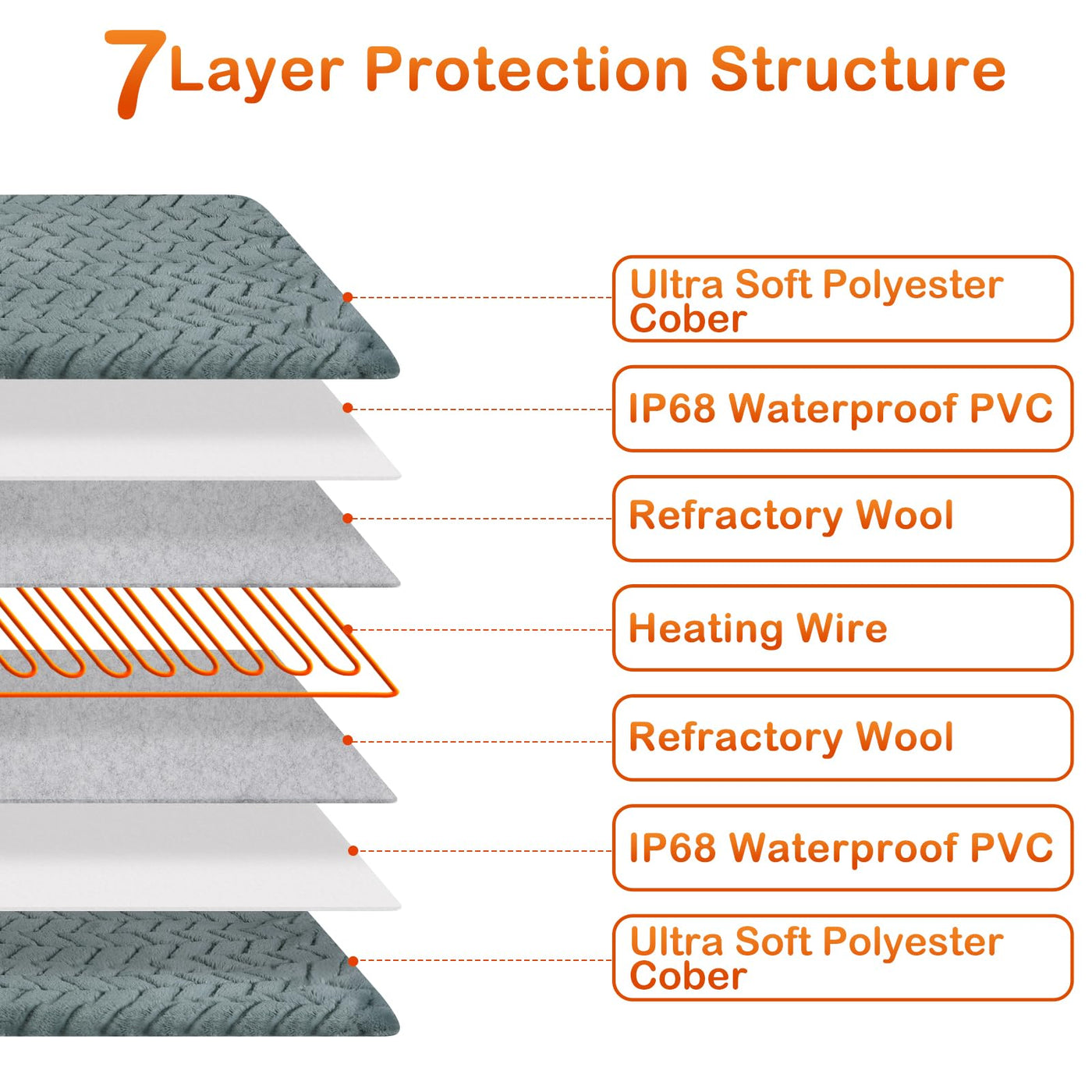 7-Layer Protective Structure Pet Heating Pad Is Made Of Soft Velvet Cover, Waterproof Pvc Enclose, Refractory Wool And Heating Wire. Flame Retardant & Waterproof Pvc Heating Pad Has The Highest-Grade V-0 Flame Retardant Capability With Ul-Certified Heating Wire To Protect Pets From Burns Scald. Do Not Allow Your Pet To Lie Directly On The Pet Heating Pad Without A Plush Cover, As This Will Make Your Pet Uncomfortable.