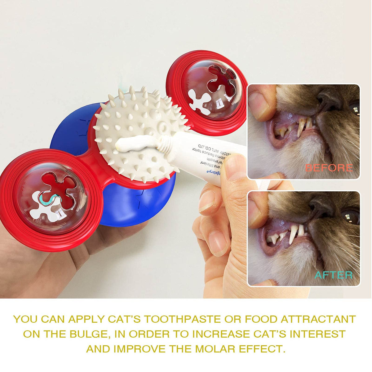 Main Specifications: Color: Multi-Colored Hight: 2.76 inches Length: 6.2 inches Material: Silicone Features: rotate freely, can be stuck to a smooth surface, cat face & hair rubbing brush, cat toothbrush toy Tips : Suggestion from one of our customers: If your cat is not interested in the windmill cat toy, try showing it to him/her for a few mins multiple times a day and also try sprinkling some catnip/ spraying it with catnip spray! Now he LOVES it!! It's SO CUTE how he's playing with it. Package includes: 1 x Windmill cat toy 1 x LED Ball 2 x Mint balls