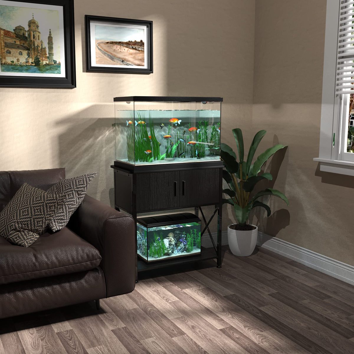 Do you have a long 20 gallon fish tank but can't find the right fish tank stand ? Then this one perfectly meets your needs. Desktop size is 28.7''*16.5''. This well designed GDLF unit is different from the other fish tank stands on the market. Most others are either the thin iron material lacking aesthetics, or are only MDF which is not strong enough, causing a safety risk. The main body of our fish tank stand is supported by durable solid steel frames which ensures the stability and long-term use. Combined iron with P2 grade, high-quality MDF cabinets, you can store all your fish tank accessories and fish food. Everything is neat and organized without having to hunt around for tools when needed. Meanwhile we offer the option to put a small fish tank (3-10 gallons) at the bottom. The black steel legs and the black wood grain door panels are a classic look which is very easy to match your home decor. This cabinet not only does the job but also looks stylish doing it. Stand Dimensions: 28.7''L x 16.5''W*31.9 H, Stand Holding Capacity:220 LBS for the tabletop and 110 LBS for the bottom shelf. Suitable for all kinds of 20 gallon Fish tanks.