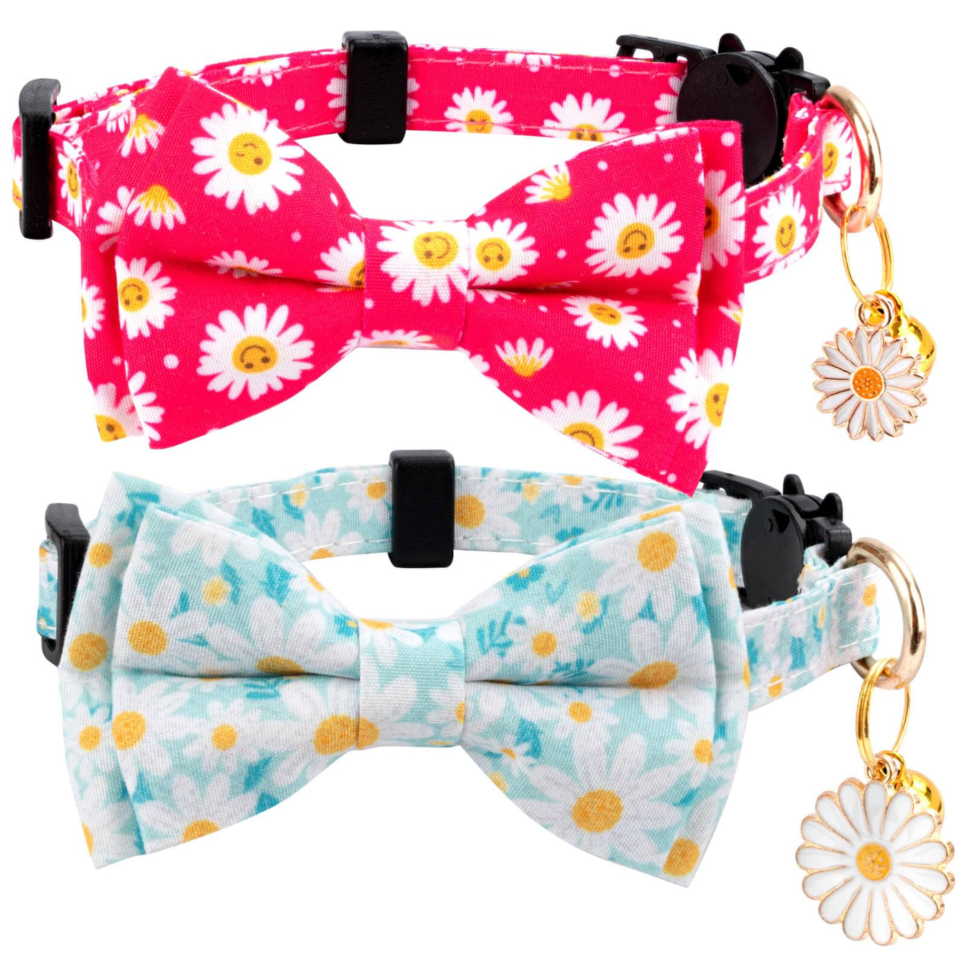 Gelwoo 2 Pack Cotton Cat Collar With Bow Tie And Bell For Male Female Cats,Soft Fancy Breakaway Kitty Kitten Collar With Flower