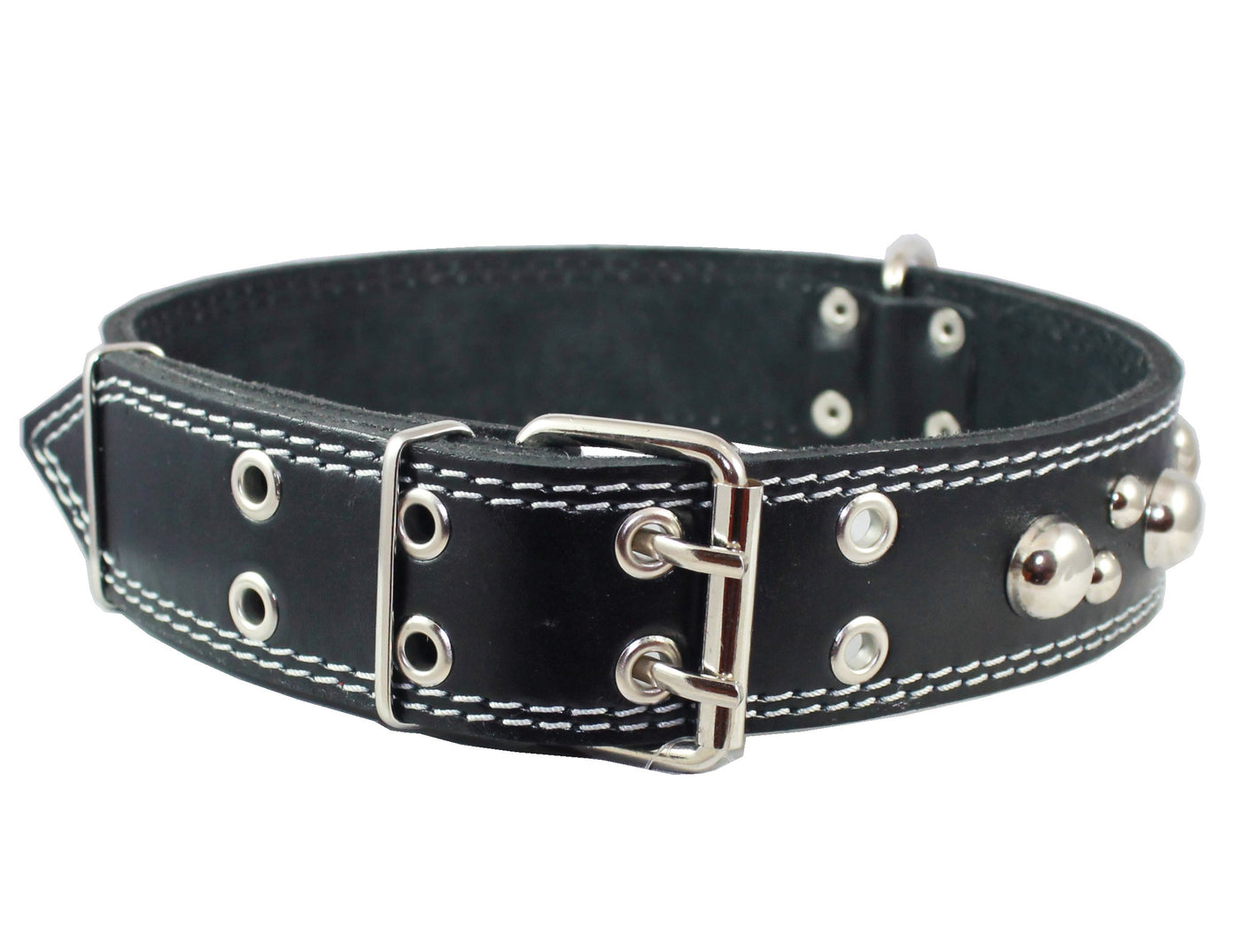 Q: What features differentiate this collar from others on the market?A: This collar stands out due to its 1.75" width, double-layer genuine leather, and stylish studded design. It also includes a double pin buckle for secure fastening and four metal enforced adjustment holes for a customizable fit.