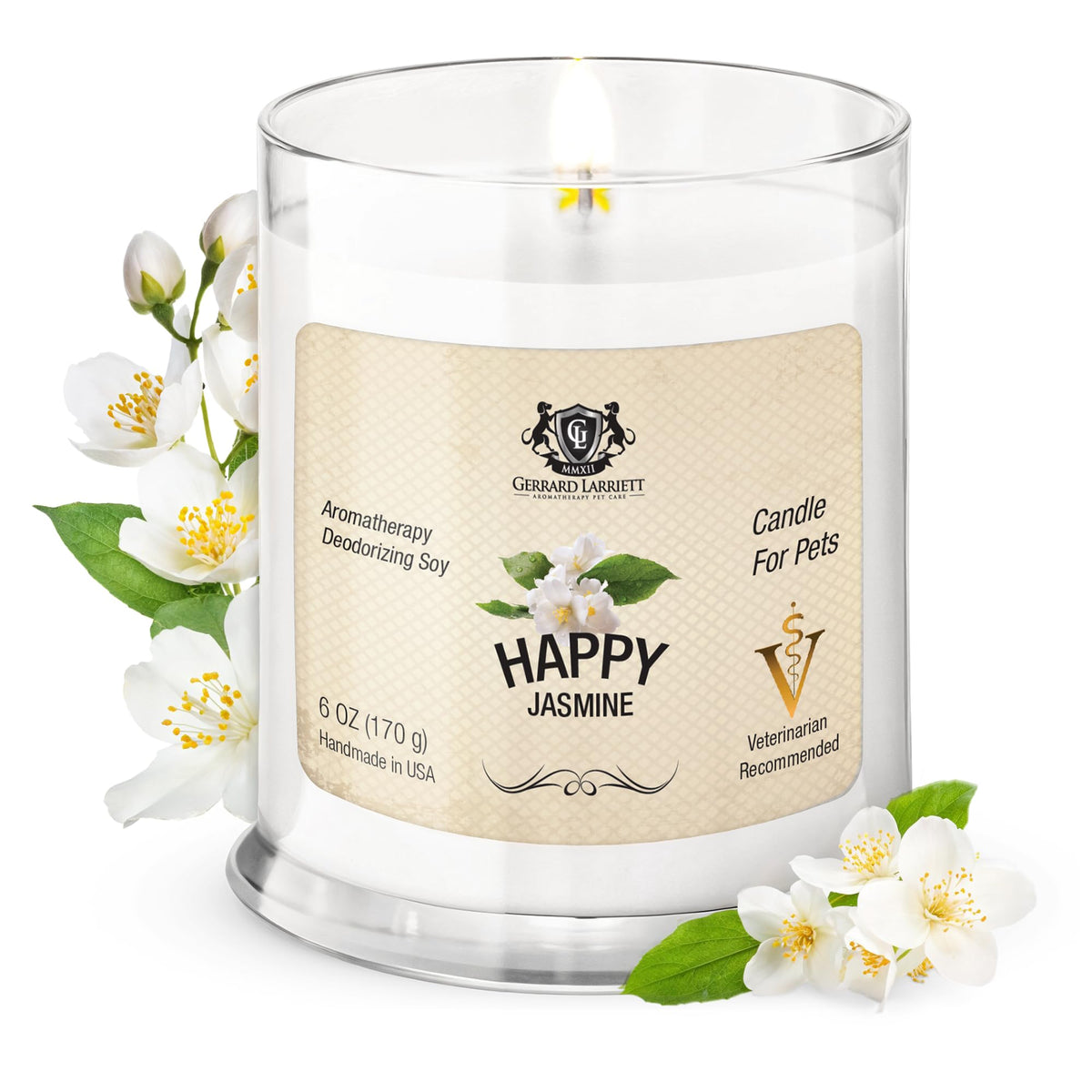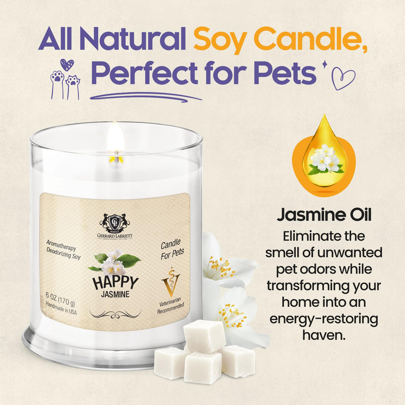 Gerrard Larriett - Deodorizing Soy Candles For Pets, Scented Candles For Removing Pet/Household Odors, Lasts Up To 40 Hours, White Candles For Home Scented With Happy Jasmine Fragrance, 10 Oz