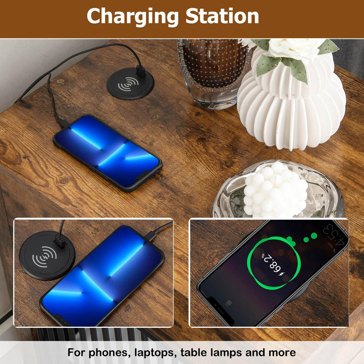 Description: The 2-in-1 dog crate is a practical addition to your home. It features a spacious dog kennel with a comfortable bed and a wide table top with a large drawer for extra storage. The plush mat is removable, washable, and easy to clean. The doghouse side table also supports wired and wireless charging, making it convenient to charge phones, laptops, and other devices. It has a cable management hole to keep cords tidy and a door lock to prevent dogs from escaping. Suitable for small dogs from 11-25 lbs. Features: Can be used as a pet crate or side table Chew-proof metal fence 3-side vented design for fresh air Removable and washable dog bed Sturdy door lock prevents your dog from escaping Non-slip foot pads protect the floor from scratches Drawer with metal slides Wired USB port & wireless charging station Cable management hole to keep multiple cords organized Dog crate suitable for small dogs weighing 11-25 lbs Specifications: Color: Rustic Brown Material: MDF, Metal, Felt, Plush Overall Dimension: 25.5 x 20 x 25 (L x W x H) Inner Size of Dog Crate: 18 x 24 x 16.5 (L x W x H) Inner Size of Drawer: 15.5 x 15.5 x 3 (L x W x H) Size of Felt Dog Bed: 23 x 17.5 x 5 (L x W x H) Size of Plush Pad: 21.5 x 16.5 (L x W) Load Capacity of Tabletop: 100 lbs Load Capacity of Dog Crate: 25 lbs Net Weight: 42.5 lbs Package Includes: 1 x Dog Crate 1 x Dog Bed 1 x User Guide