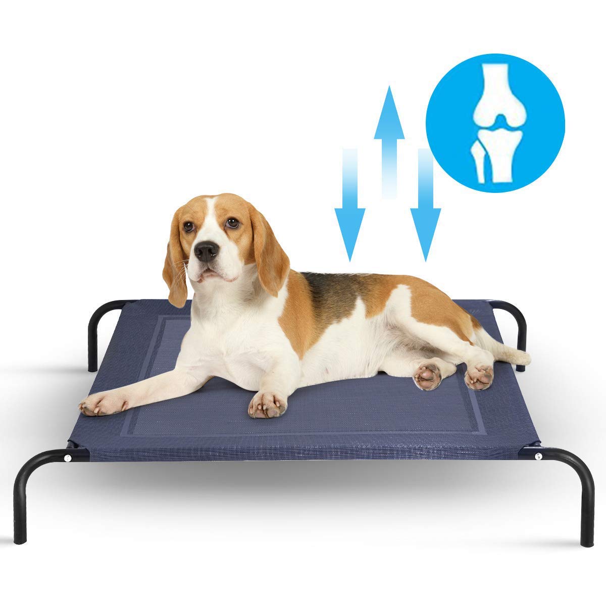 [Stay Cool]Off-the-ground bed design keeps your pets cool by increasing air flow from all sides. Your pets can stay cool in peak summer. Besides, Sleeping with an elevated dog bed is more comfortable and cleaner compared to the ground. | [High Quality Materials]With aging resistant, breathable and waterproof textile mat and powder-coated steel, this dog bed is very durable and sturdy. | [Portable and Lightweight]The portable design makes it ideal for indoor, outdoor, picnic, camping, training. | [Easy to Assemble and clean]Our dog bed is very easy to assemble with instruction. All screws and hex tool included. | [Different Sizes]The large size is 43.5 x 31.5 x 7, can hold up to 88lbs. The extra-large size is 52 x 36 x 8, can hold up to 150lbs. Suitable for medium and large dogs.