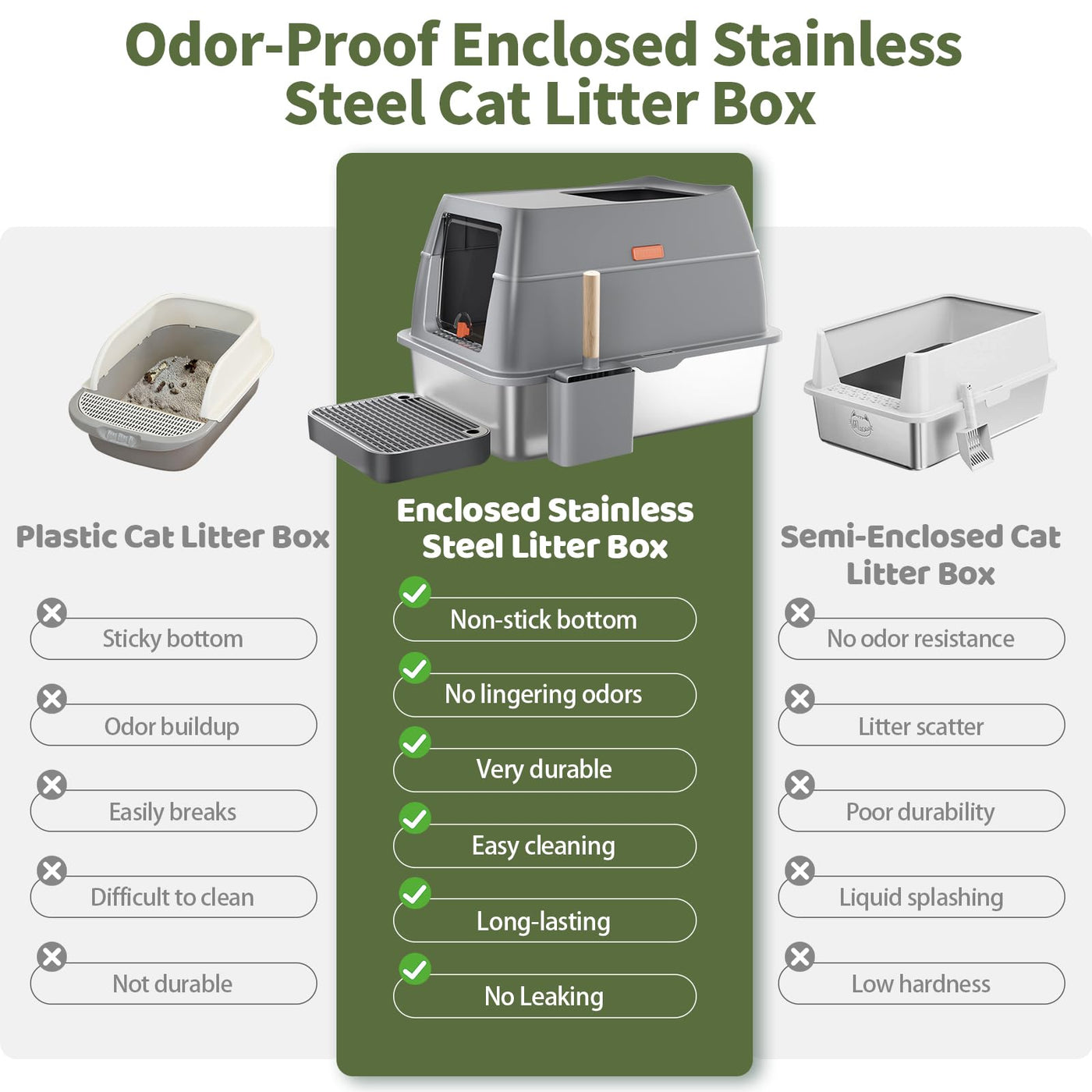 Gimars 3 In 1 High Sided Anti-Leakage Stainless Steel Cat Litter Box With Lid, Extra Large Enclosed Easy Cleaning Litter Box Wit