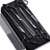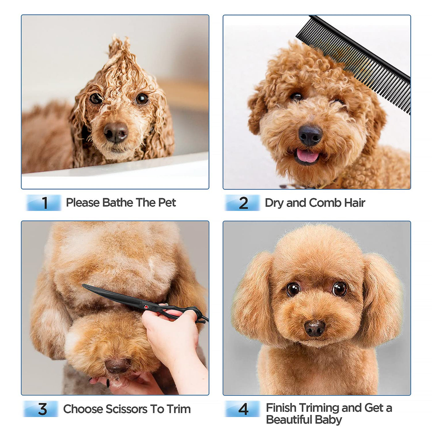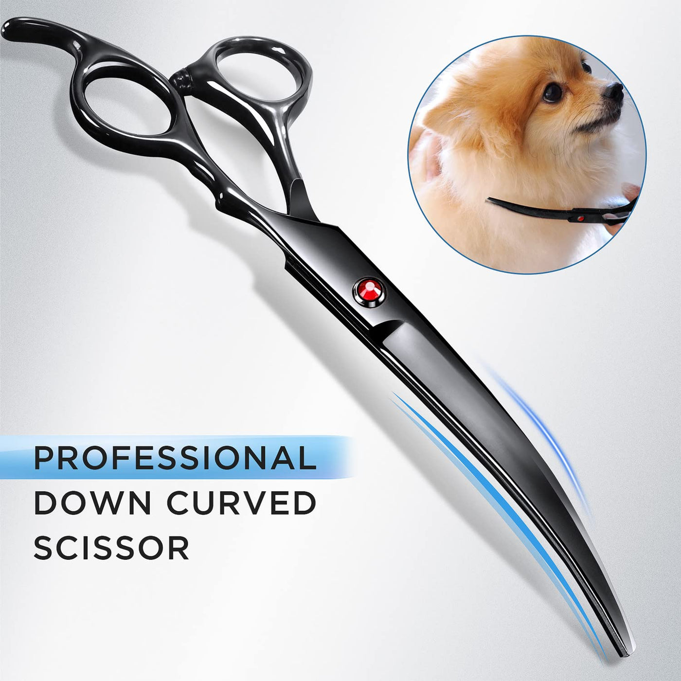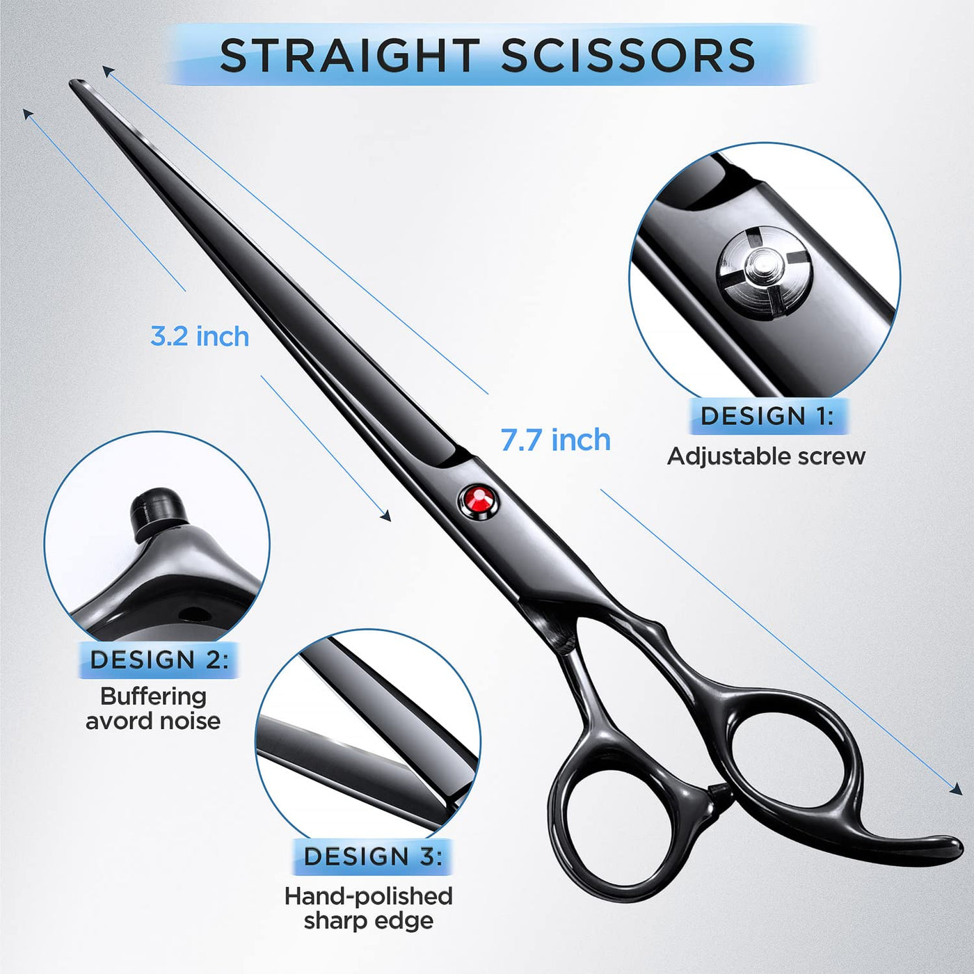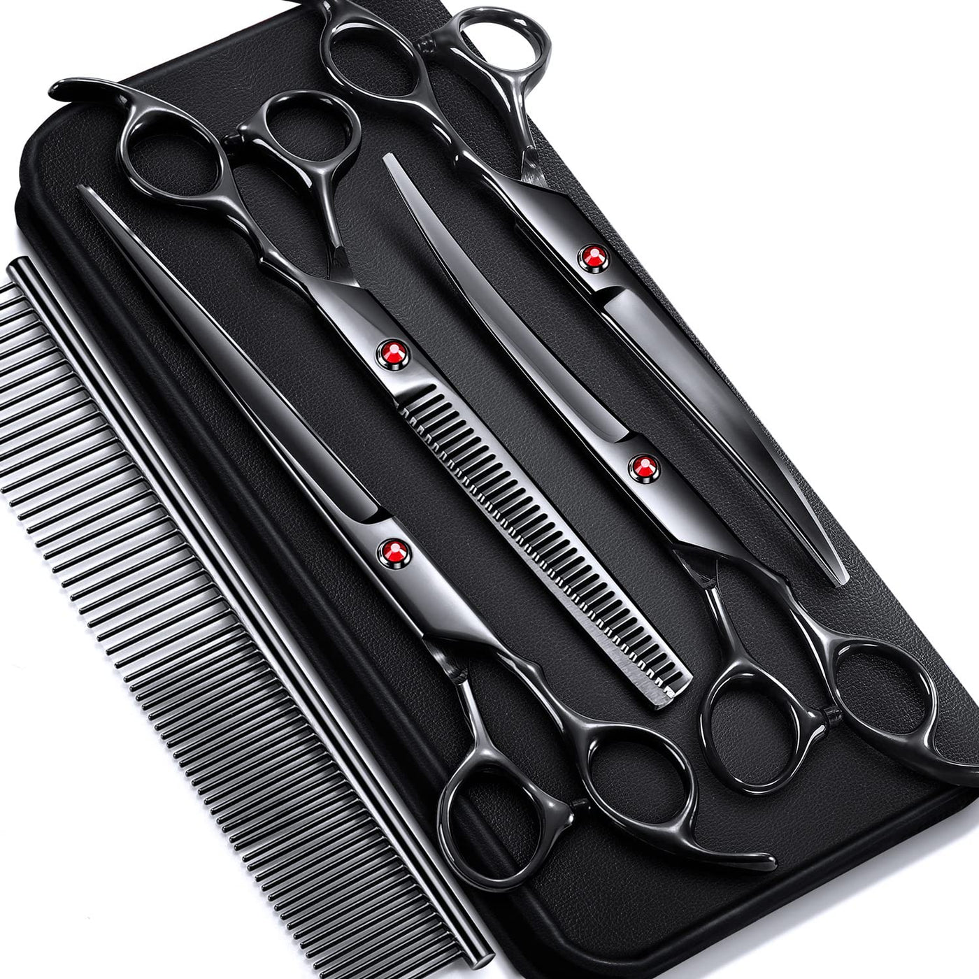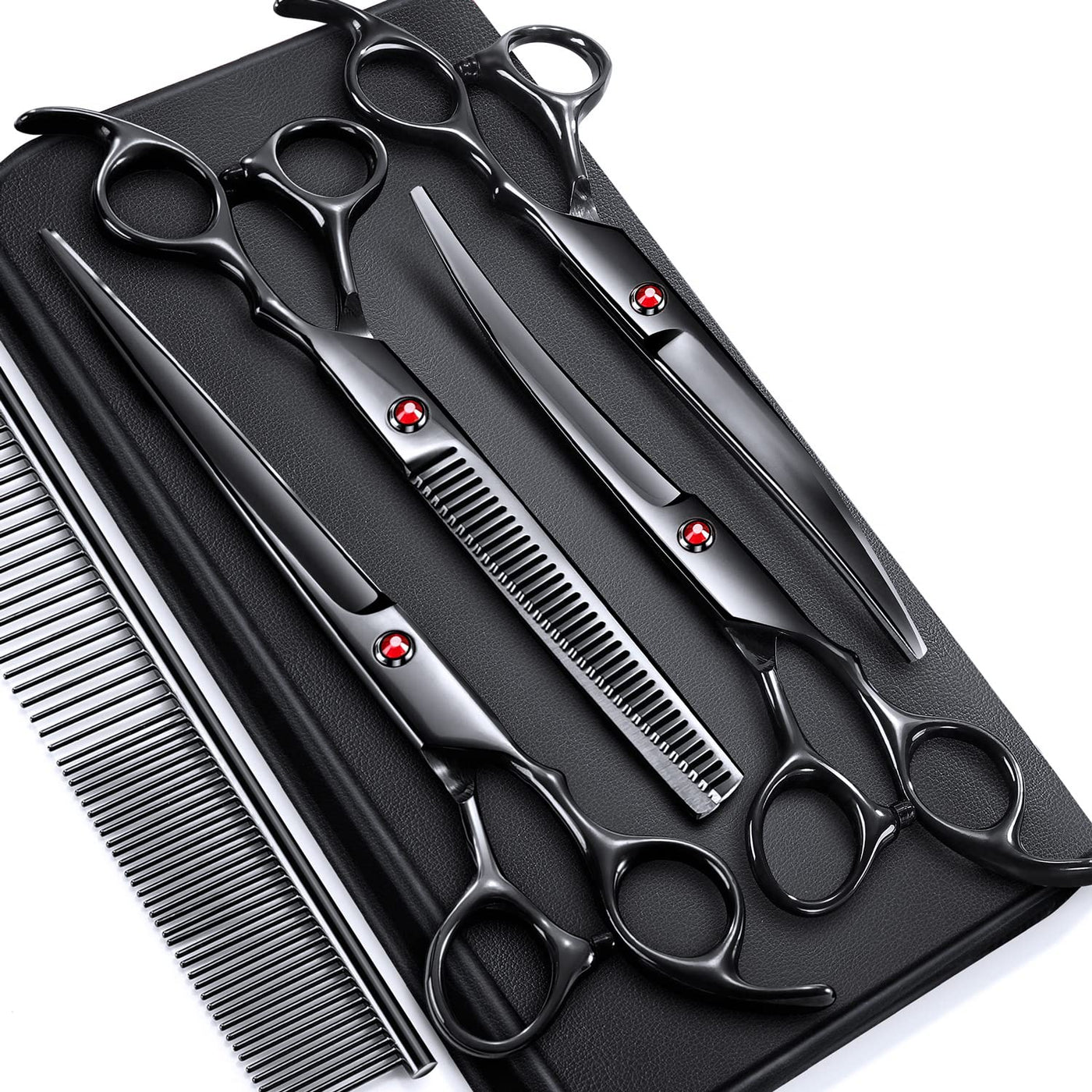 ?Professional Dog & Cat Grooming Essential Tool for Groomers?Gimars dog grooming scissors are made of 4CR stainless steel materials, dipped in a ceramic coating and suffer 60 process carefully polishing and grinding, which makes blades will not rust, cleaned easily and keep the blades sharp for a longer time than stainless steel without this sheath | ?Sharp Convex Edge & Safety Round Tip?The sharp convex edge makes the cutting of these dog grooming scissors professional and more smooth and stable, great for eliminating hair mats and tangles. Safety round tip keeps pets safe no Injured facial, not scare the pets | ?Ergonomically Designed for Holding Comfortably?We also know how tiresome grooming can be, so we made the handles ergonomically designed to fit comfortably in your hands and your hands don't get tired and sore while using the scissors | ?6 in 1 Dog Grooming Scissors Set?The dog grooming scissors set comes with 2 straight scissors, 1 thinning scissor, 1 curved scissor, 1 grooming comb and 1 storage case | ?Professional After-sale Service?We are professional pet product manufacturers and confident in the quality of the products, so we provide 3 months unconditional return. If you are not satisfied with our products, you can contact us anytime and we will provide the most professional after-sales service