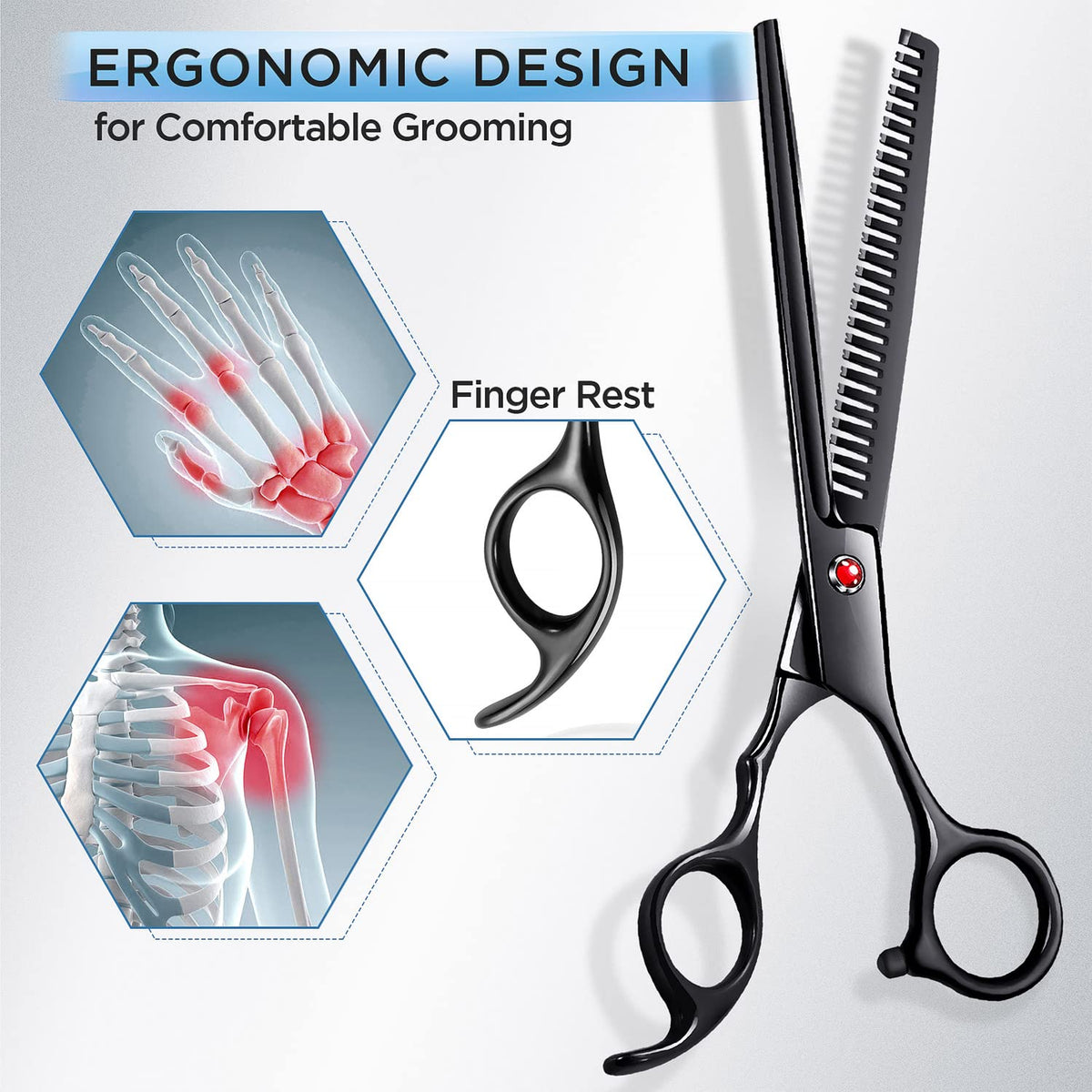 Q: Are these dog grooming scissors safe for pets?A: Yes, the scissors feature a safety round tip design, which helps prevent injuries to your pets during grooming. This design is particularly beneficial for sensitive areas, ensuring a safe grooming experience without scaring your pets.