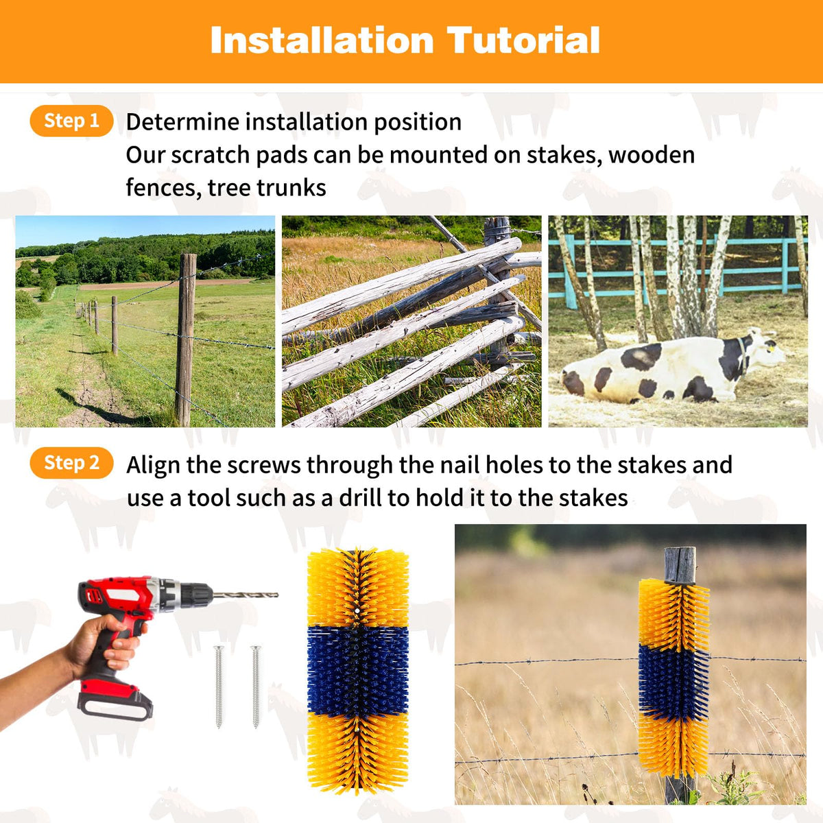 About Livestock Scratcher Brushes Features Our cattle massage brush is designed to provide the maximum soothing scratching experience for livestock and is specifically designed to meet your livestock grooming needs. The stiff bristles of this scratch brush are made of high-quality nylon material that wont harm your livestocks skin or hair. The bristles are dense, sturdy and resistant to shedding, damage and breakage, effectively removing dirt and irritants from your animals skin, preventing skin problems and solving scratching and massaging issues. Size Our set includes 17.52*7.87 inch bristles that are 2.2 long, a livestock scratching brush, and and two 3.95 inch spikes that help hold the cattle brush securely where you want it to be, providing the stability needed for comfortable scraping of livestock. Carefully crafted multi-functional horse grooming brush, if you have a friend who runs a farm around you, you can give them our scraping brush. It will be a perfect, thoughtful gift that they will be happy to receive.