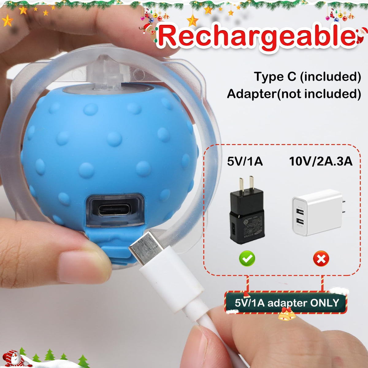 View pic 5 - Rechargeble cat ball come with type c cable easily fully charge within 2-3hrs. ***Choose 5V/1A adapter will more compatiable. Lights flashing when charge keeping on when fully charged view user guide to get more detail