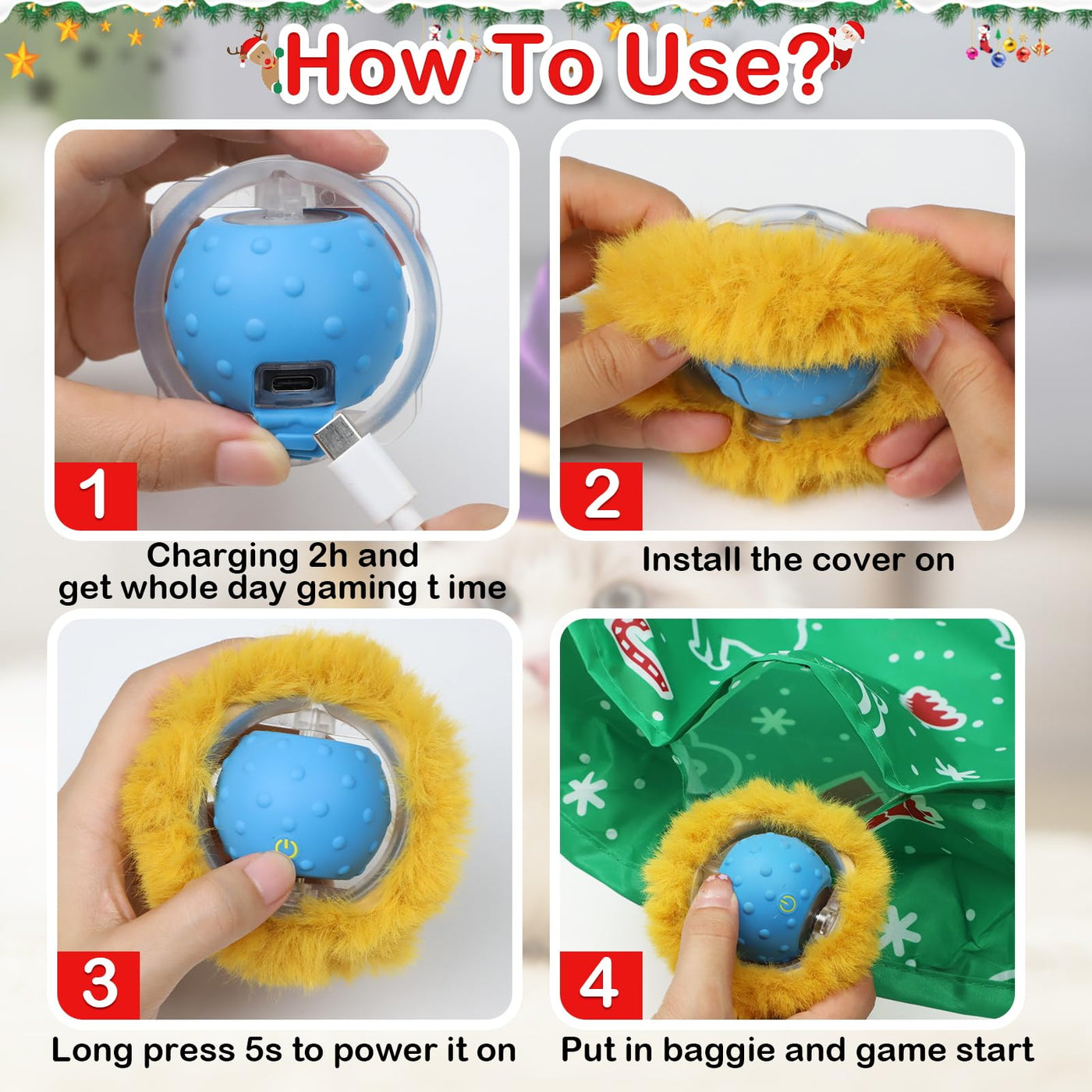 Electric cat ball rolling inside the baggie make kitty in pouncing scratching catching biting hunting indoor game. No matter worried in finding ball everywhere. This Christmas pocket will bring you more funny in party time